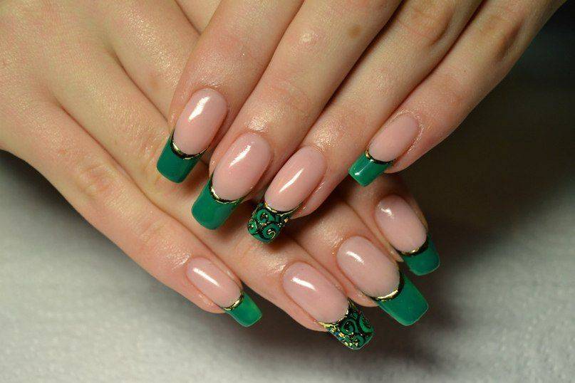 Очень популярен маникюр на короткие ногти в изумрудном или зеленом цвете.