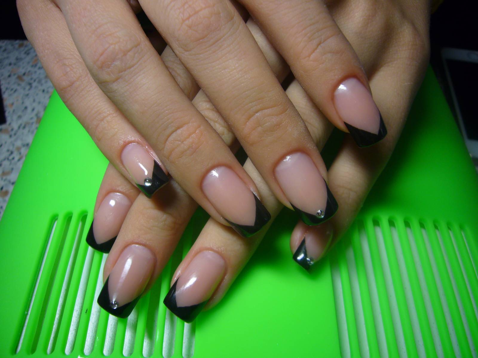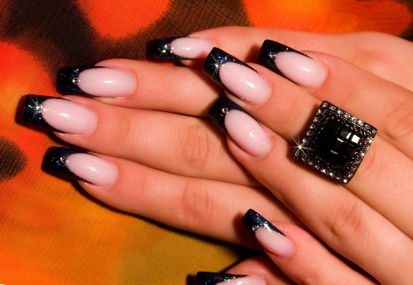 Замечательным декором для стандартного французского маникюра являются стразы и слайдеры. Стразы с легкостью придают френчу уникальности и дороговизны. Такой маникюр подойдет для светского раута или вечеринки. Стоит учитывать, что на длинных нарощенных ногтях крупные стразы смотрятся лучше, на натуральных же могут оставаться повреждения после их снятия. Чтобы данной ситуации не происходило, лучше выполнить маникюр гель-лаком, а уже потом добавить стразики. Тогда ноготки не повредятся.