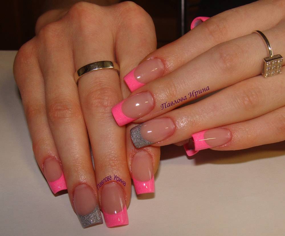 Для французского маникюра имеются привычные оттенки (белый и нюдовый тон). Но сегодня мода прогрессирует все быстрей и быстрей. Дизайн ногтей идет в ногу с модными тенденциями. Именно поэтому привычные оттенки французского маникюра сменились на разнообразные оттенки. К примеру, стиль твист подразумевает в себе не только разноцветие улыбки, но и яркие фоны. Для идеального дизайна французского маникюра используют различные виды декора: камни, трафареты, стразы, ленты, глиттер и пигменты с разнообразными эффектами. Для создания оригинального квадратного маникюра используют роспись в ручном исполнении. Дизайн делается в виде абстракции, узора или конкретного рисунка.