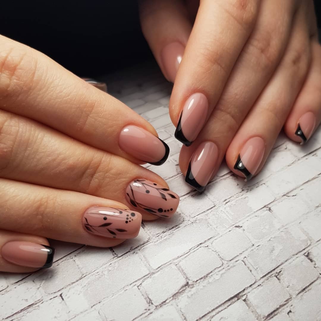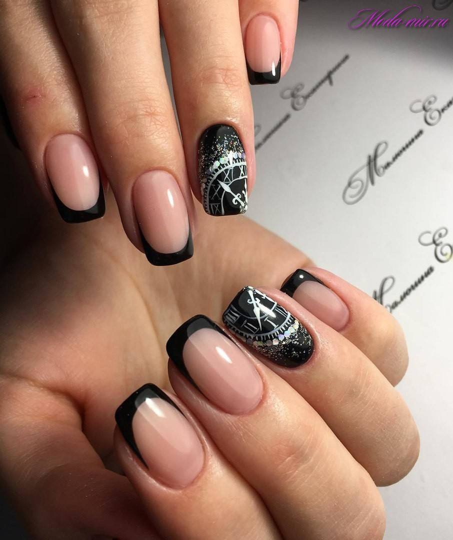 Круглая форма ногтевой пластины очень схожа по форме с овальной или миндалевидной. Отличием является то, что она имеет более плавные очертания, без резких углов. Великолепно будет смотреться на такой форме чёрный френч. Маникюр в этом оттенке сегодня не воспринимается так неоднозначно, как раньше, и пользуется большой популярностью. Френч в таком цвете подчёркивает ваш вкус и стиль. Чёрный цвет очень удачно гармонирует с розовым, белым и многими другими оттенками. Смело используйте технику выполнения френча не только в глянцевом варианте. Попробуйте добавить матовый оттенок или акриловую пудру в маникюр. Прекрасно смотрится чёрный френч с глиттером и фольгой по краю ногтя.