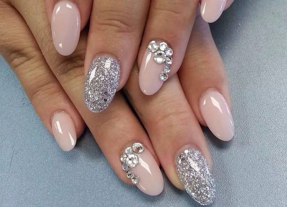- Блестки прекрасно сочетаются с другим декором. Это могут быть стразы, бульонки.