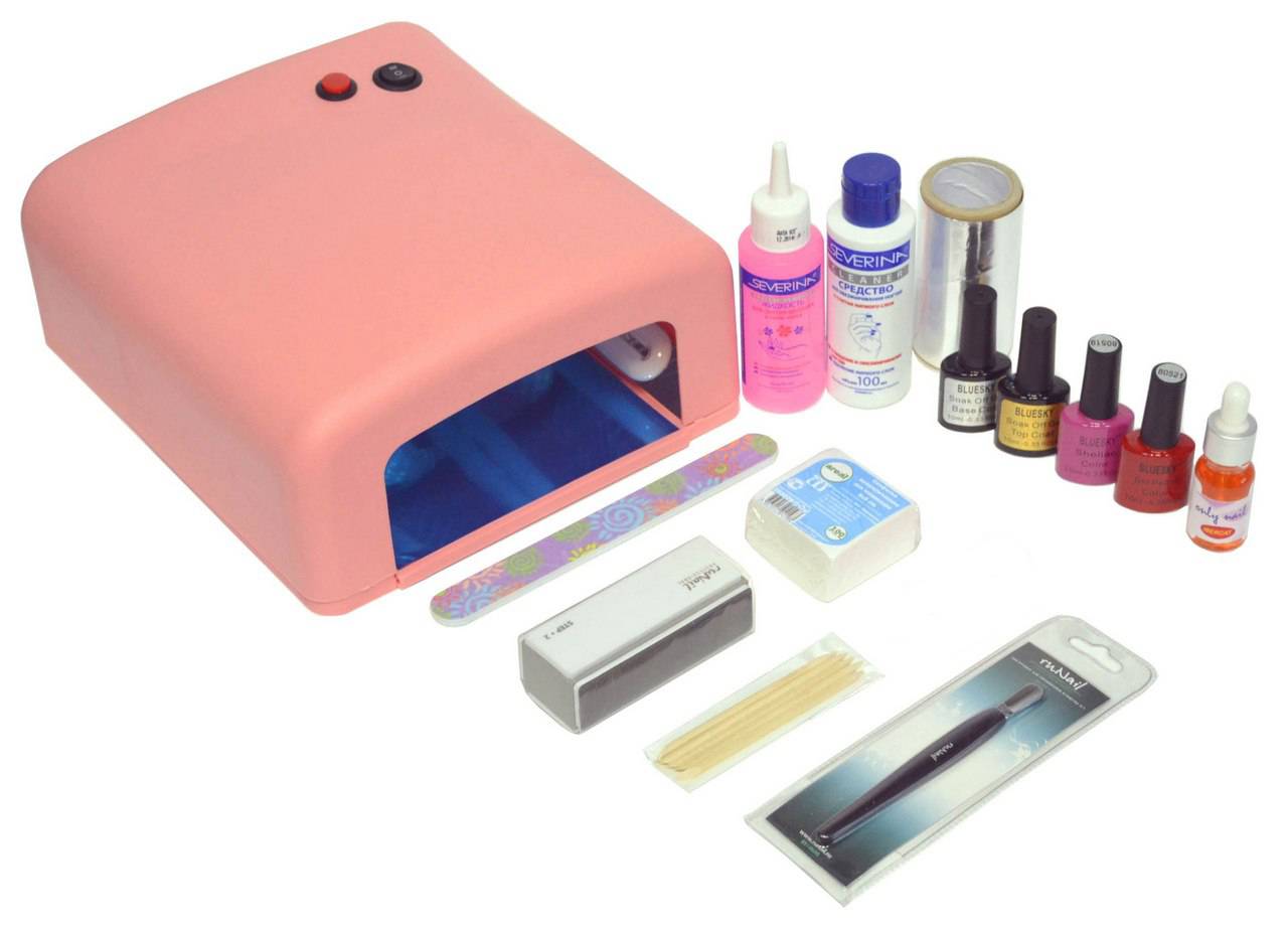 - ультрафиолетовая лампа, которая нужна для того, чтобы сушить шеллак. Обычными способами средство не высушить. Под действием ультрафиолета покрытие полимеризуется. Мощность лампы должна быть не меньше 36 Ватт;
