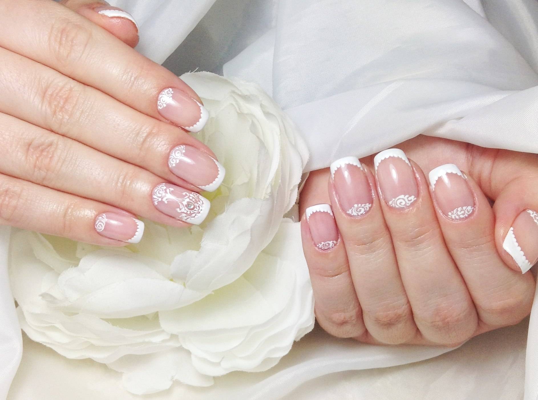 | свадебный френч | Дизайн украшается различными элементами: кружево, вензеля, лепка, стразы, жемчужины, маникюрные ленты и многое другое. |