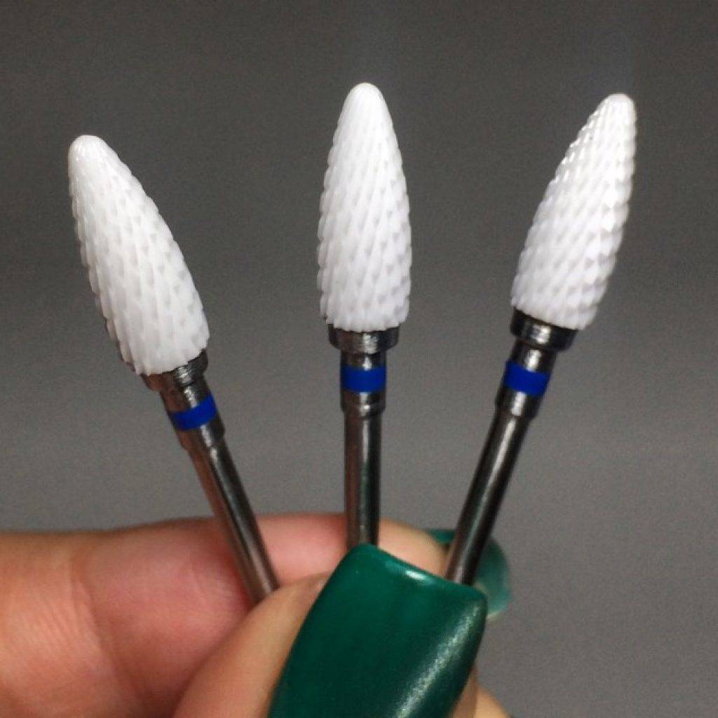 Фрезы из керамики могут входить как в комплект профессионального аппарата, так и в мини-набор для домашнего использования. Жёсткость керамических насадок меньше, чем у алмазных. Они используются для обработки наиболее сложных участков: