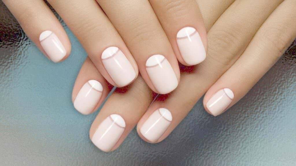 Лунный маникюр. Присутствуют нововведения, возможно окрашивание и лунки и свободного края в один оттенок. Допускается использование трех цветов, одновременного применения матовых и глянцевых лаков.