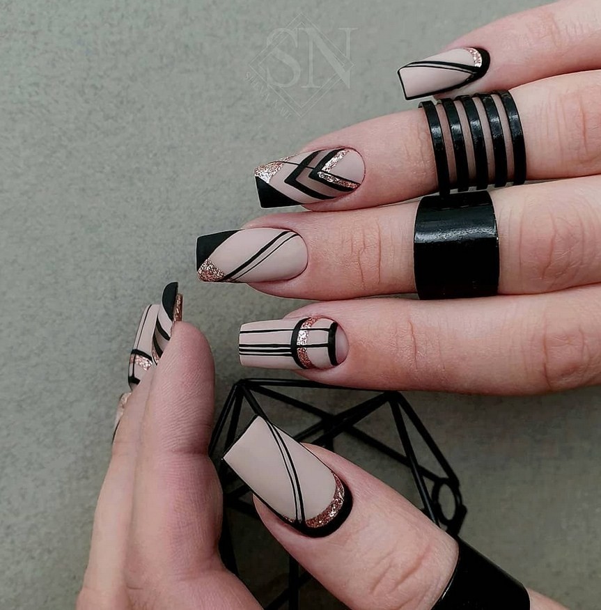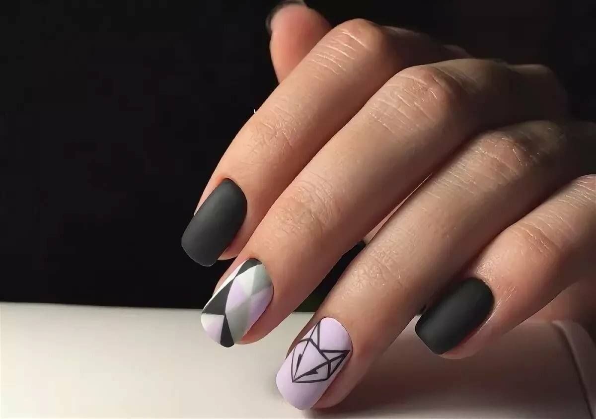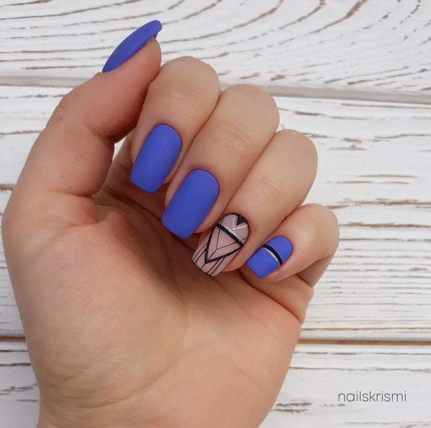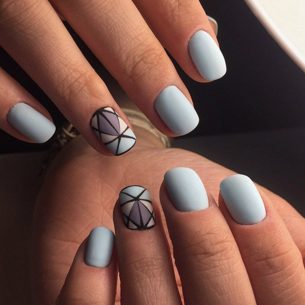 Выразительный томный дизайн. Он элегантен и оригинален. Здесь подойдёт любая идея. Матовый маникюр с геометрией — это высший пилотаж. Настолько он интересен.