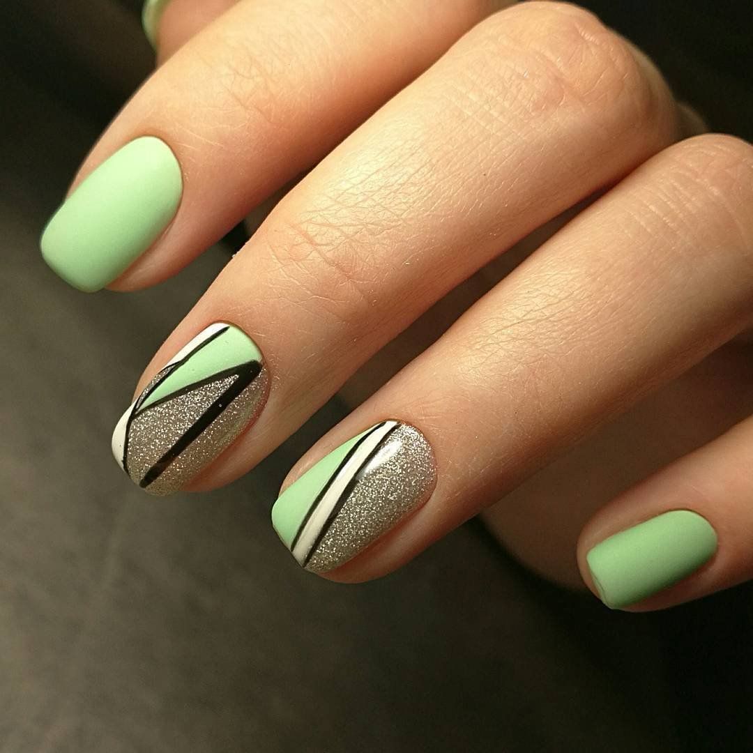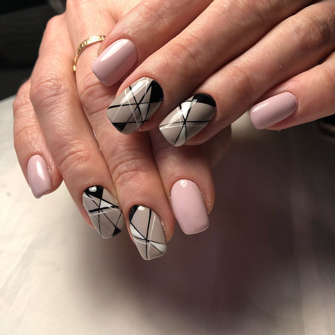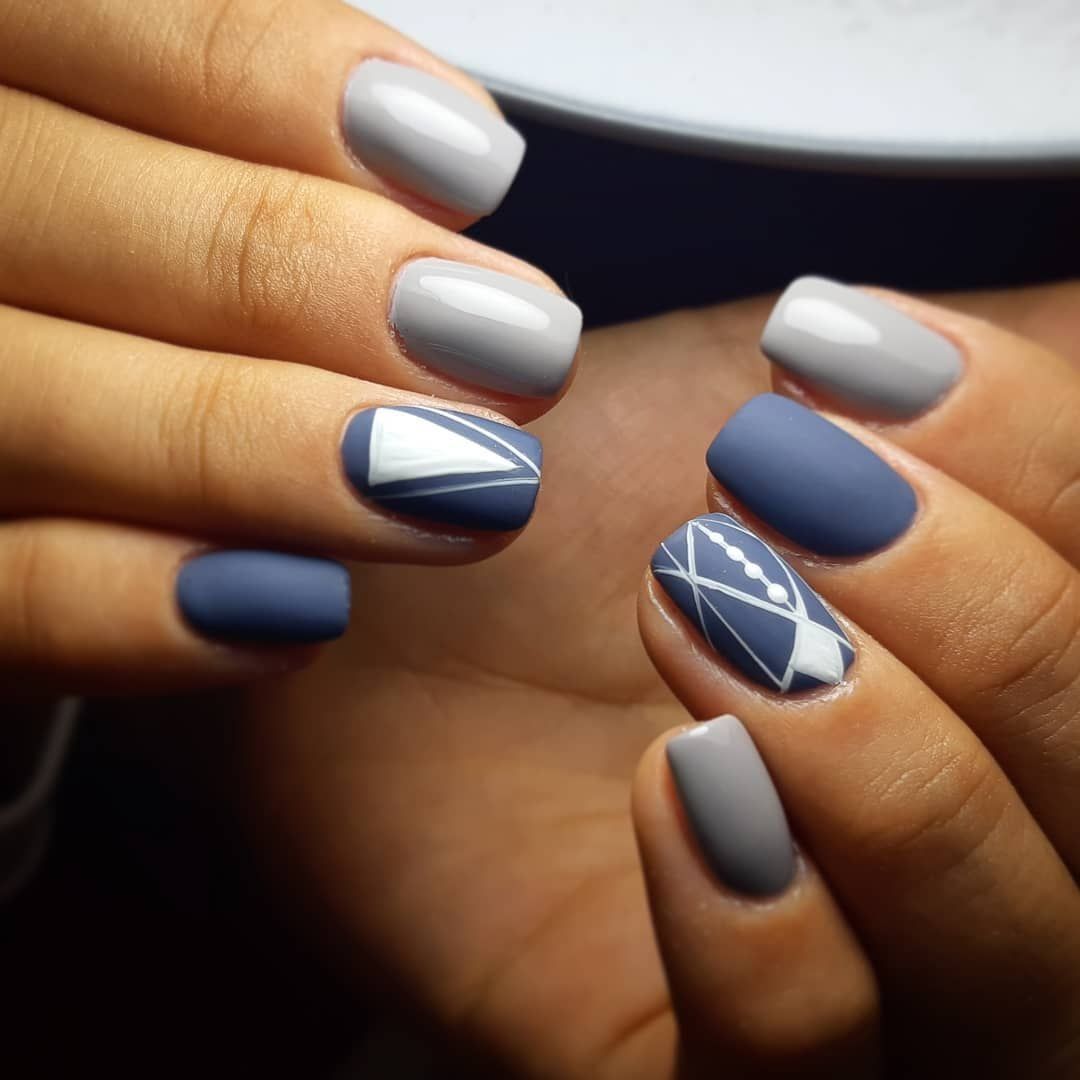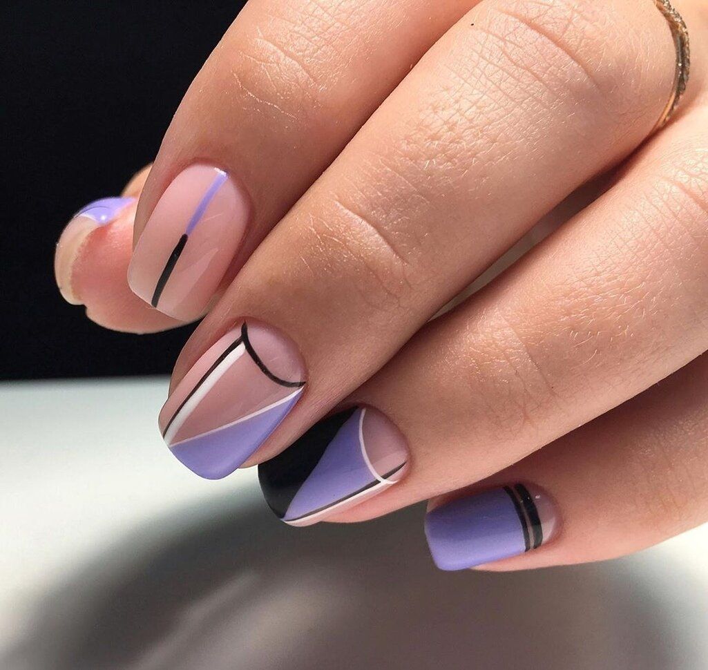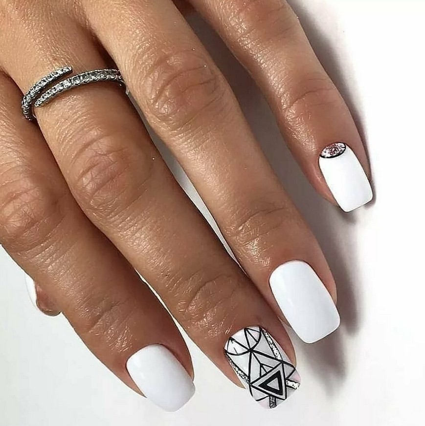 Отличный вариант для абстракции. Такой маникюр создаёт стиль. Для геометрии берут светлые оттенки — белый, серебристый, серый или беж.