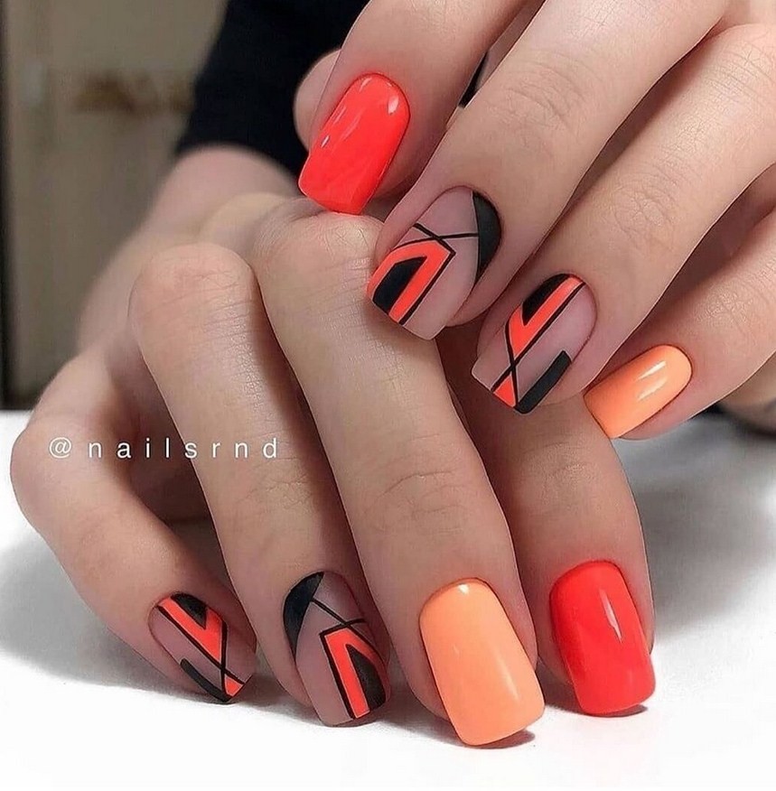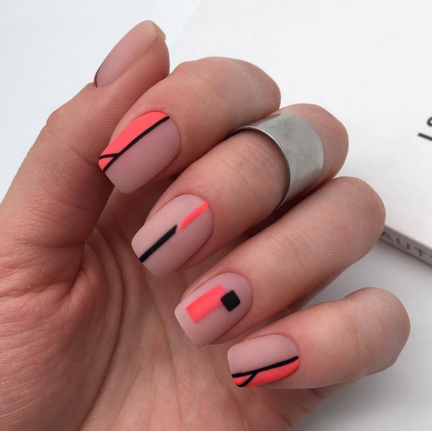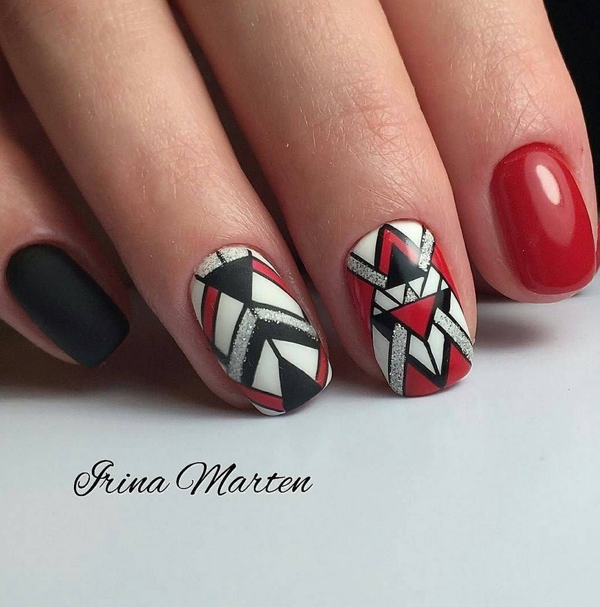 Дизайн ногтей «Графика» с использованием оттенков красного, бежевого, белого и черного не выходит из моды. Геометрия подходит под разную форму ногтей. Особенно эффектно будут смотреться контрастные сочетания, к примеру белые полосы на черном матовом фоне.