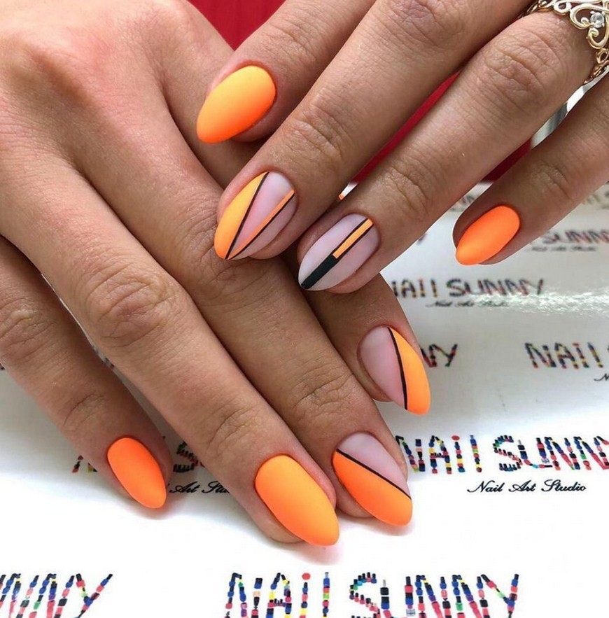 Миндалевидной и овальной формам больше подойдут единичные наклейки на ногтях, либо частичное украшение пластины в геометрическом стиле. Также можно добавить ярких элементов, или выполнить фигурный нейл-арт в неоновых тонах.