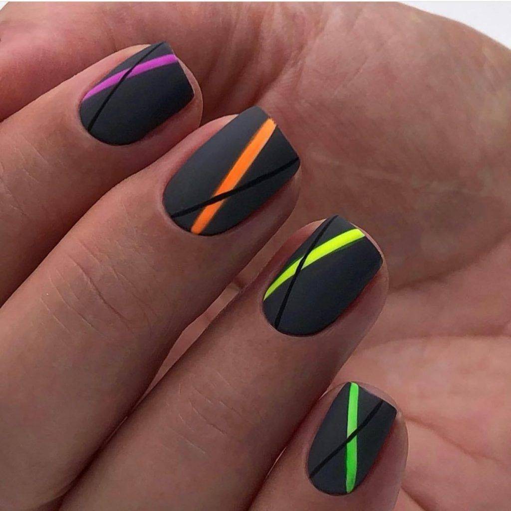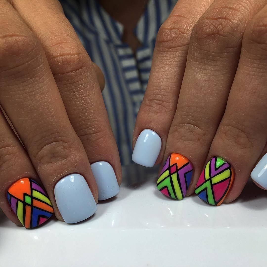 Маникюр с самым летним настроением тоже редко обходится без геометрических мотивов. Это могут быть простые полосы в тематических цветах или дизайн с морскими элементами.