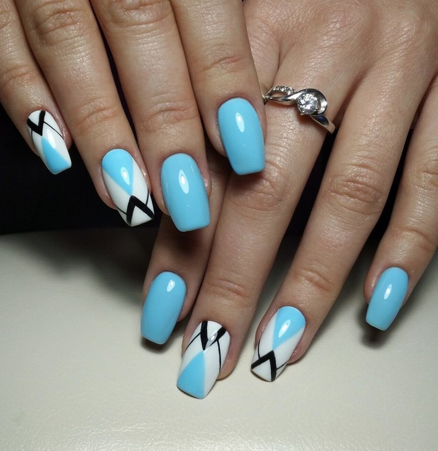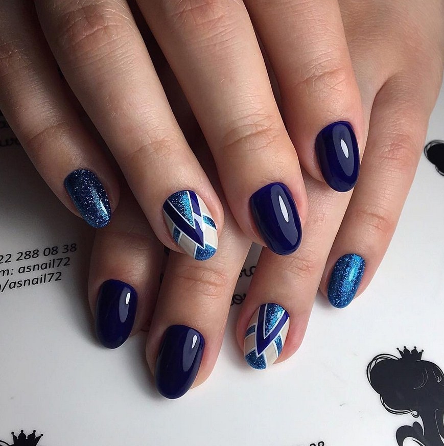 - Синие цвета — вы можете выбрать любой оттенок синего, от нежно-голубого до темно-синего, в результате вы получите оригинальный эффектный маникюр. Благодаря ярким элементам дизайна женщина сможет украсить свой образ и сделать его не только супер стильным, но и эффектным;