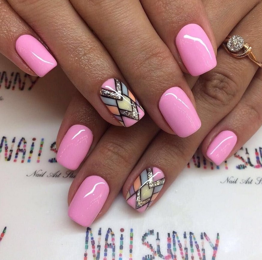 Геометрия на ногтях сочетается с ярким декором. Смело используйте камешки, стразы, блестки. В качестве декора можно выбрать абстрактный элемент, создать аппликацию в виде квадрата, ромба, треугольника.
