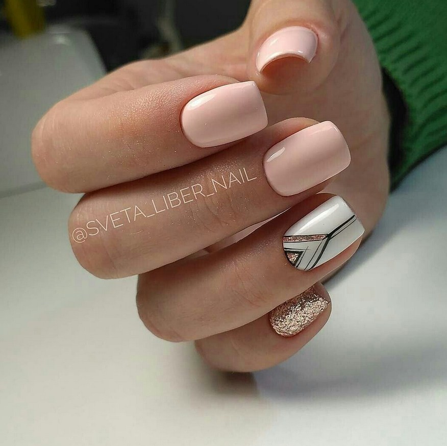 Ваша задача – выбрать наиболее подходящий оттенок лака, и дополнить его небольшими геометрическими линиями. Можно использовать фольгу, блестки, но в идеале декор должен быть неброским. Отличное решение для бизнес-леди!