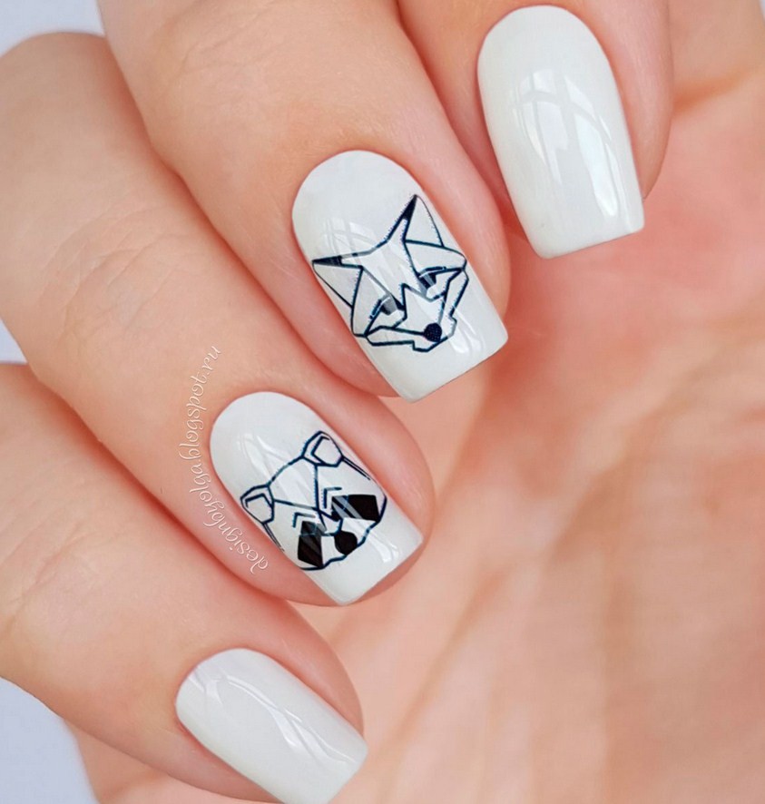 Маникюр с геометрическим рисунком животных – безоговорочный тренд на протяжении нескольких сезонов. Такой дизайн напоминает японское искусство оригами. Он выглядит стильно и оригинально. Модницы любят изображать на ноготках лису или волка в геометрическом варианте, но можно нарисовать и других животных.