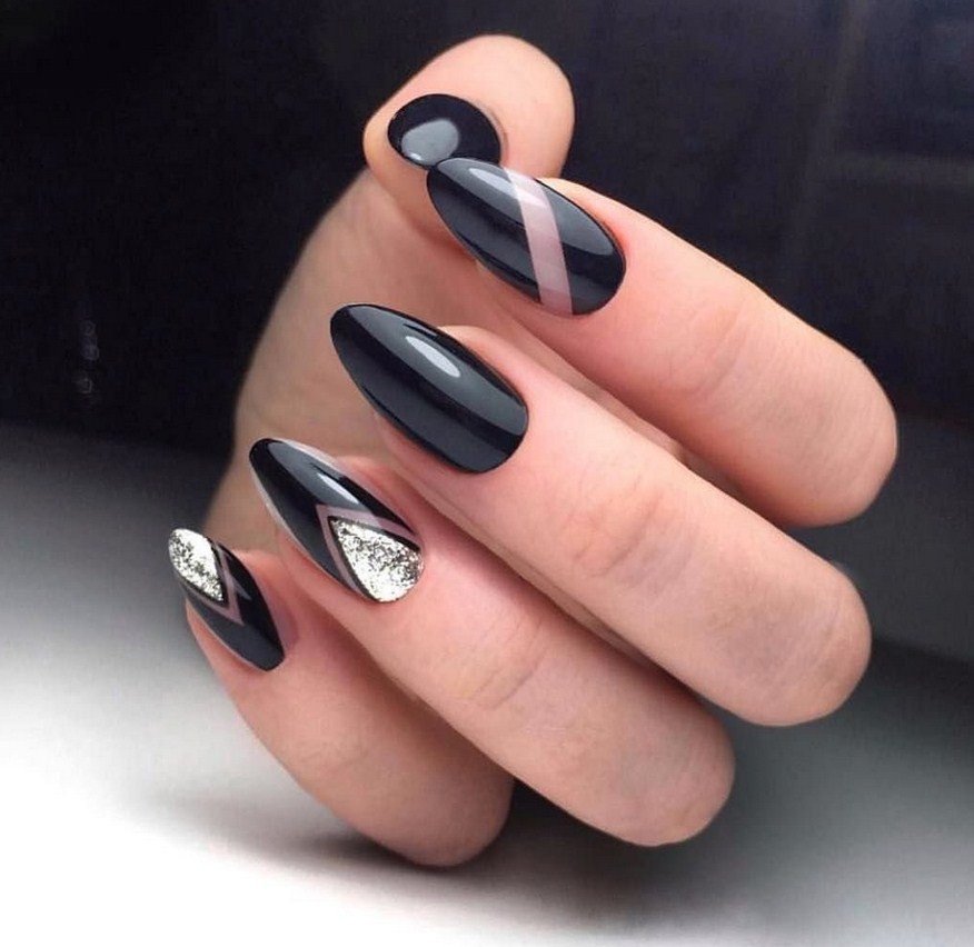 Хотите добавить немного шика геометрическому дизайну? Тогда подключайте блестки к его созданию! Это может быть глиттер, хлопья Юки, стразы или блестящий лак. Придерживайтесь чувства меры при таком декоре и у вас получится потрясающий маникюр.