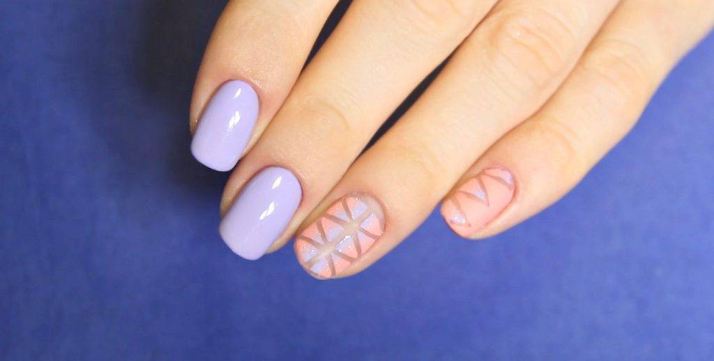 Фишка дизайна – легкий и непринужденный принт, который можно использовать в качестве отдельного покрытия, так и служить фоном маникюра посложнее. В качестве основы послужит белый лак. А контрастными цветами могут стать любые пастельные тонами: абрикосовый, мятный и сиреневый. Для выполнения маникюра с геометрией потребуется несколько трафаретов-уголков и тонкая веерная или круглая кисть.