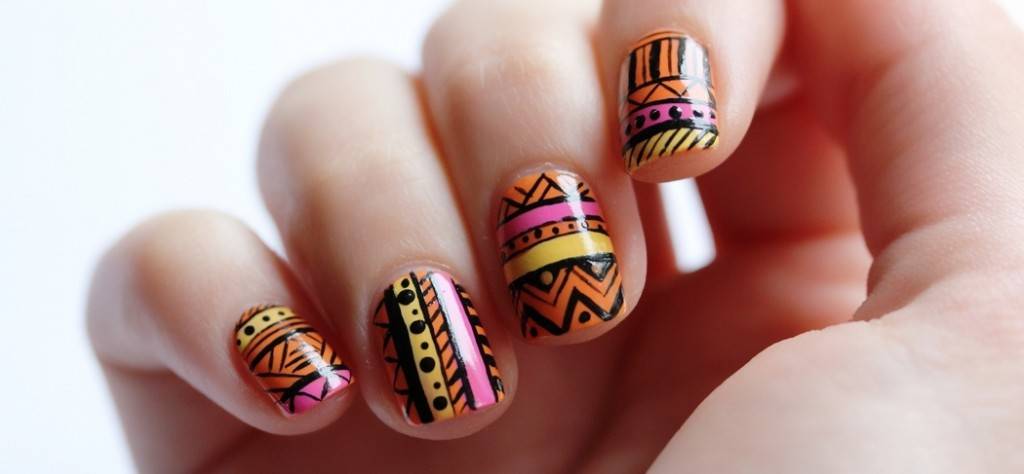 Очень гармонично смотрятся на ноготках полоски разной ширины. Они могут располагаться горизонтально или рисоваться под любым углом. Приветствуются всевозможные фигуры: треугольники, квадраты, ромбы и многоугольники любых форм, наносимые на поверхности ногтя хаотично или в определенном порядке. Любопытно смотрятся также геометрические иероглифы или фигурки людей, животных, птиц, прорисованные тонкими прямыми линиями.