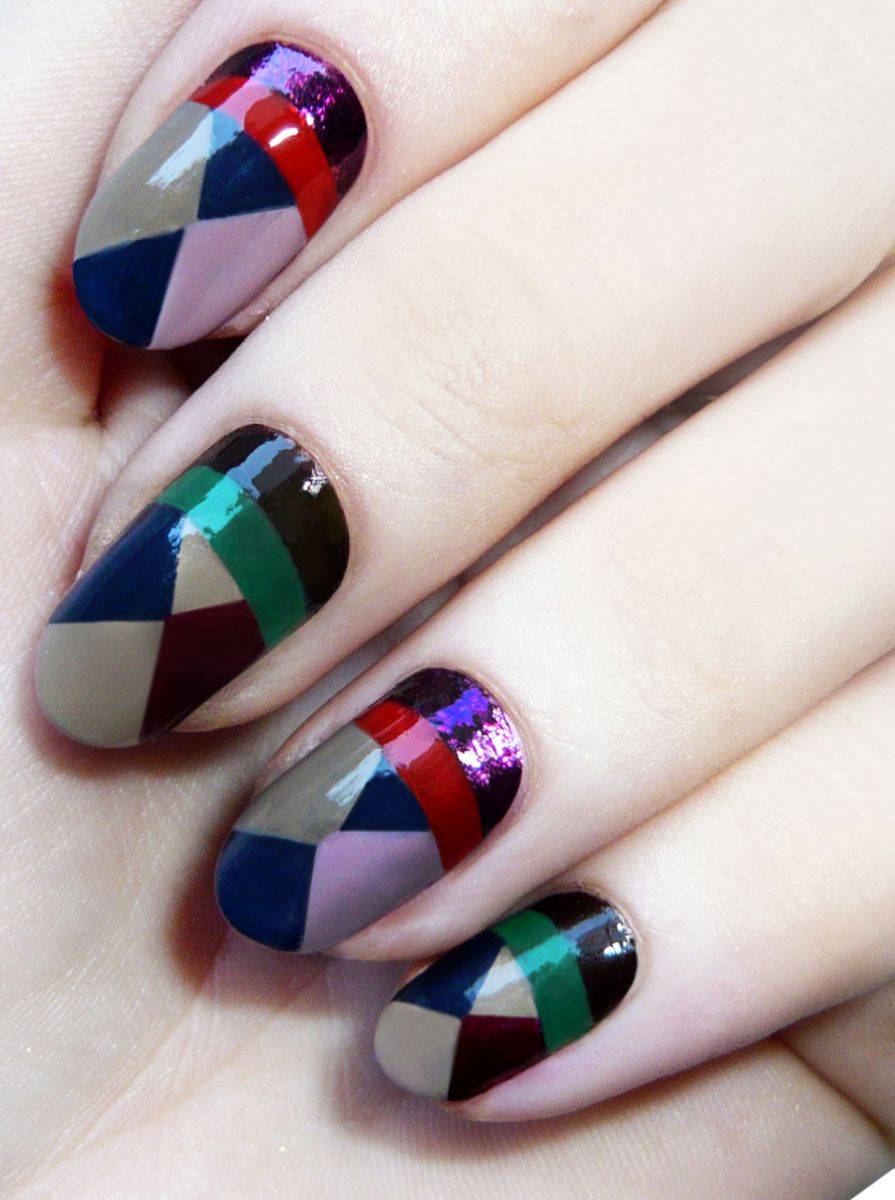 Для создания геометрического рисунка с помощью кисточки необходимы лаки нескольких оттенков, закрепитель и собственно инструмент для рисования. Сначала ногти покрывают 1-2 слоями лака и на высохшей поверхности рисуются узоры.
