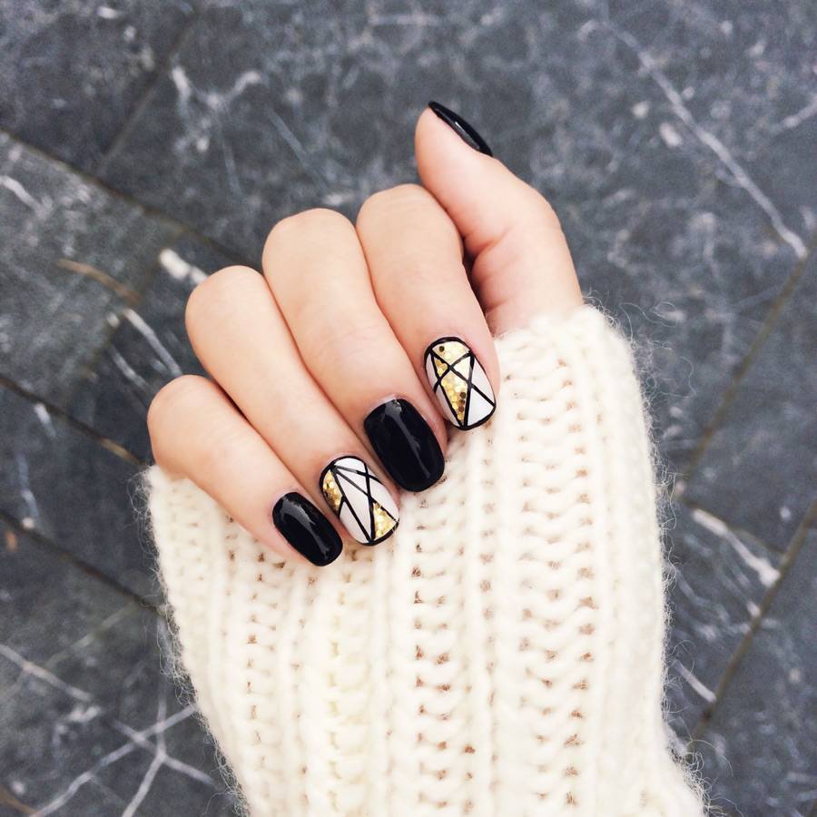 Если вы еще не испробовали маникюр с геометрическим дизайном на себе, то самое время сделать это сейчас. Для того чтобы создать собственный неповторимый, красивый и оригинальный шедевр, используйте разные виды трафаретов, штампов, липкие ленты или обыкновенный скотч: Как наносить штамп на ногти. В сочетании с геометрическими рисунками также отлично смотрятся стразы, цветной песок и камифубуки (блестящее конфетти для дизайна ногтей) Как рисовать вензеля на ногтях.