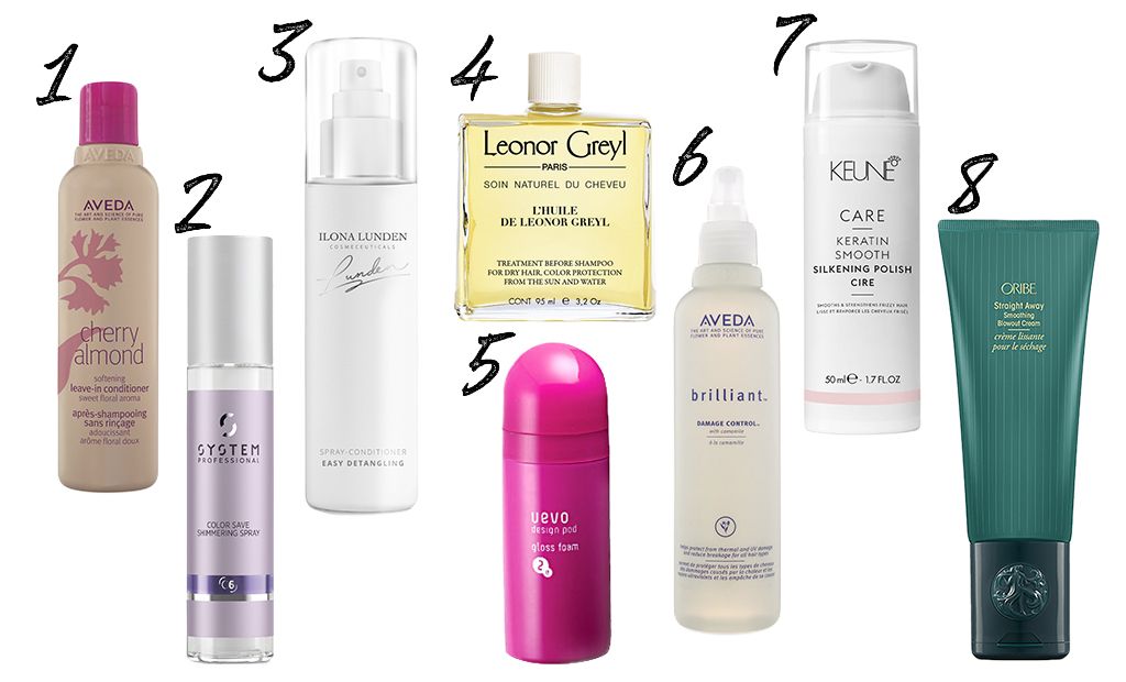 1 – вишнево-миндальный несмываемый кондицонер для волос Aveda, 2 – шиммер-спрей для сияния окрашенных волос Color Save C6, System Professional, 3 – спрей-уход, облегчающий уход волос и придающий им блеск Ilona Lunden, 4 – многофунцкиональное масло L’Huile, Leonor Greyl, 5 – мусс слабой степени фиксации и для выраженного блеска волос Demi, 6 – cпрей-уход для термальной укладки Brilliant Damage Control, Aveda, 7 – крем с кератиновым комплексом для блеска волос Keune