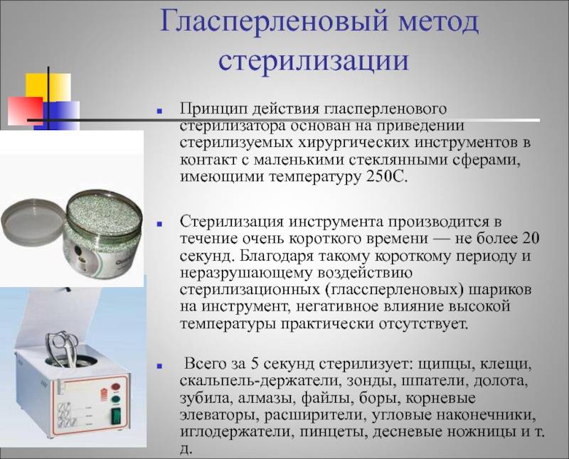 Гласперленовое приспособление обеспечивает надежную стерилизацию инструмента за минимальное время. Главный минус его использования – стерильна после обработки только погруженная в шарики поверхность. Хранить инструмент в нем нельзя.