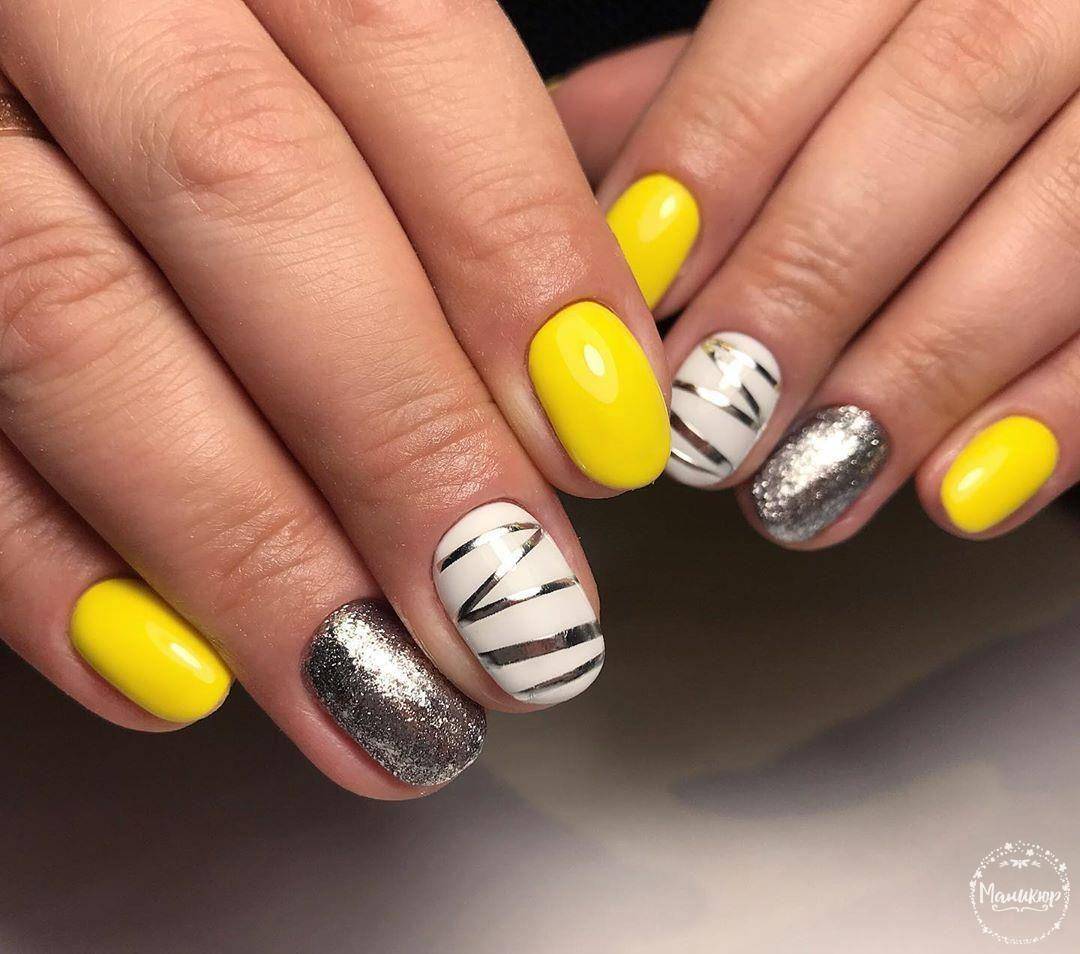 Геометрические узоры предоставляют модницам прекрасную возможность при каждом оформлении маникюра создавать всё новые и новые потрясающие идеи нейл-дизайна. Блёстки в этом случае только подчёркивают изысканность маникюра. На светлых ноготках очень красиво смотрятся всевозможные полоски, зигзаги и волны, которые могут выполняться как другими оттенками лаков, так и самими блёстками