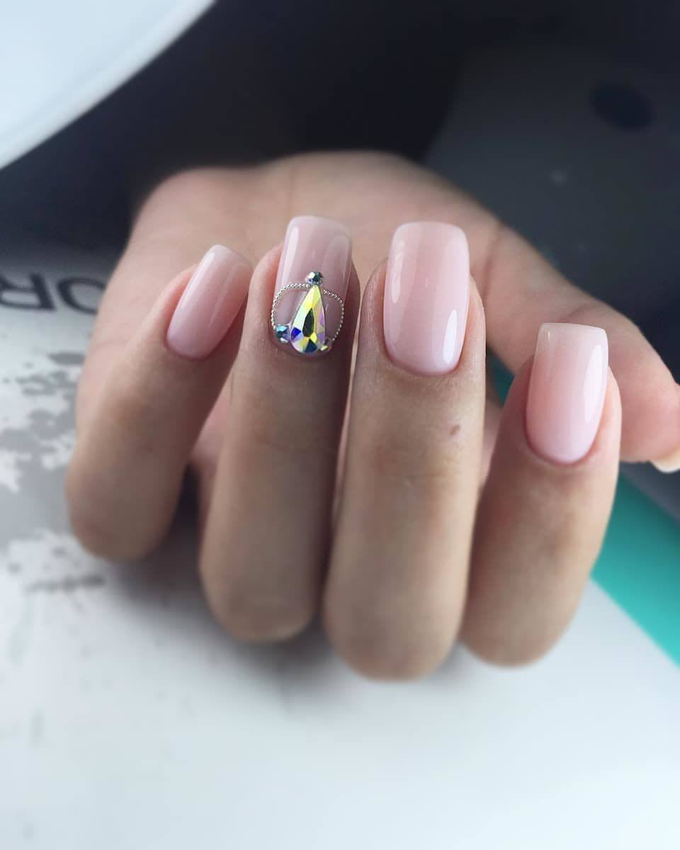 Добавьте к однотонному фону стразы или бульонки в прикорневой зоне, оформите один из ноготков глиттером, меланжем, гелем-тянучкой. Что касается расположения стразов, то выполните дизайн в прикорневой зоне, сделайте простую геометрию, например, полоску посередине ногтя, крест. Эффектно смотрится растяжка стразами по одному из ноготков. Несмотря на обилие стразов, такой маникюр шикарно смотрится в повседневным образах