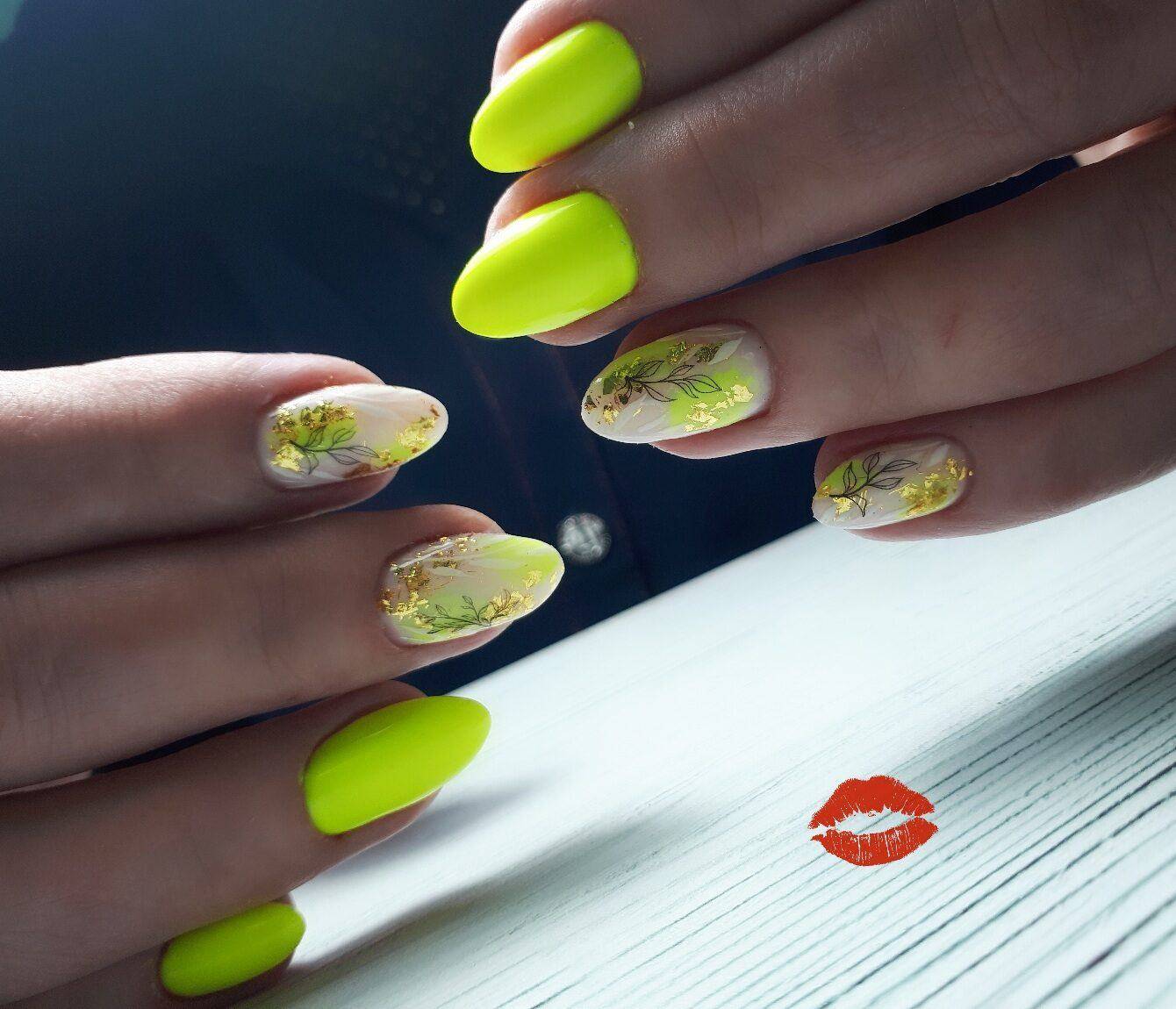 Флористический рисунок занимает лидирующее место в числе актуальных для 2020 года. Поэтому не удивительно, что его комбинируют с френчем. Разнообразные цветочки, листья, а также пальмы и даже ель можно изобразить на ногтях любой длины и формы. Главное — подобрать подходящие оттенки, чтобы такой дизайн смотрелся гармонично.