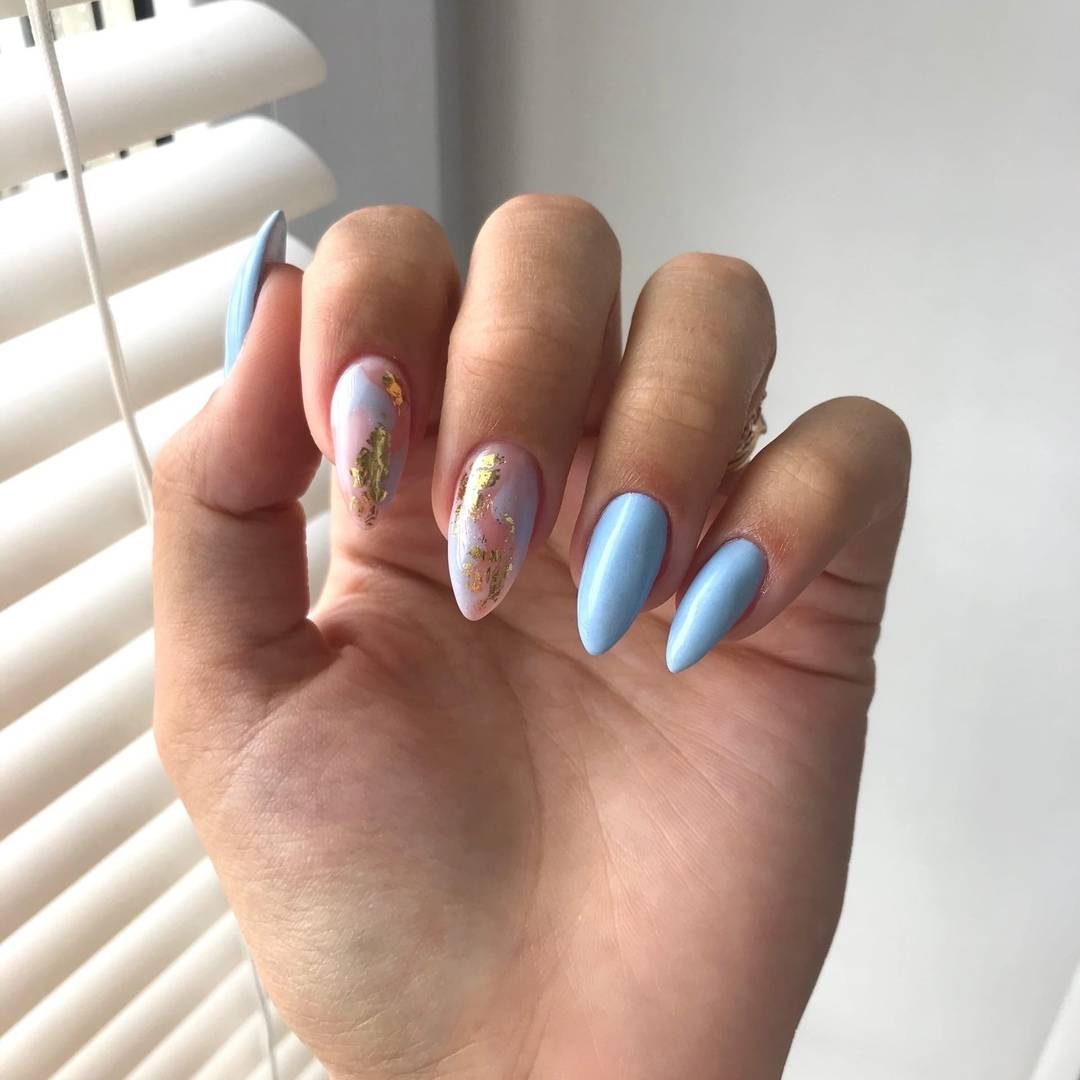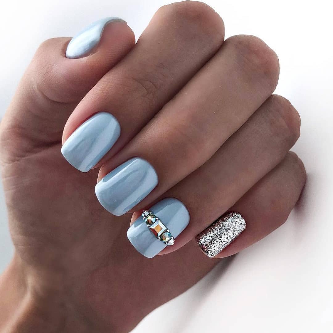 Голубой цвет относится к светлой цветовой палитре, поэтому чаще всего нуждается в дополнительном декоре. В нашем случае это стразы, бульонки, шармы, камни и другой блестящий материал. Не рекомендуется оставлять однотонный голубой маникюр без какого-либо дизайна.