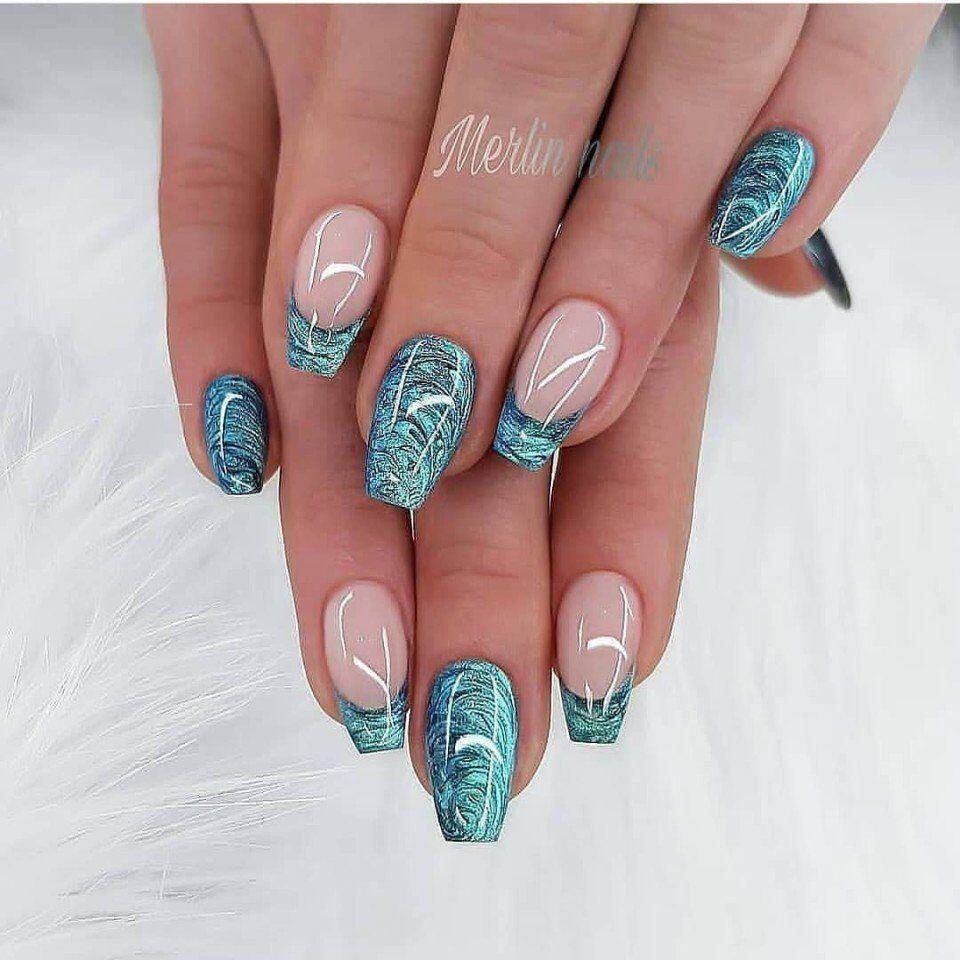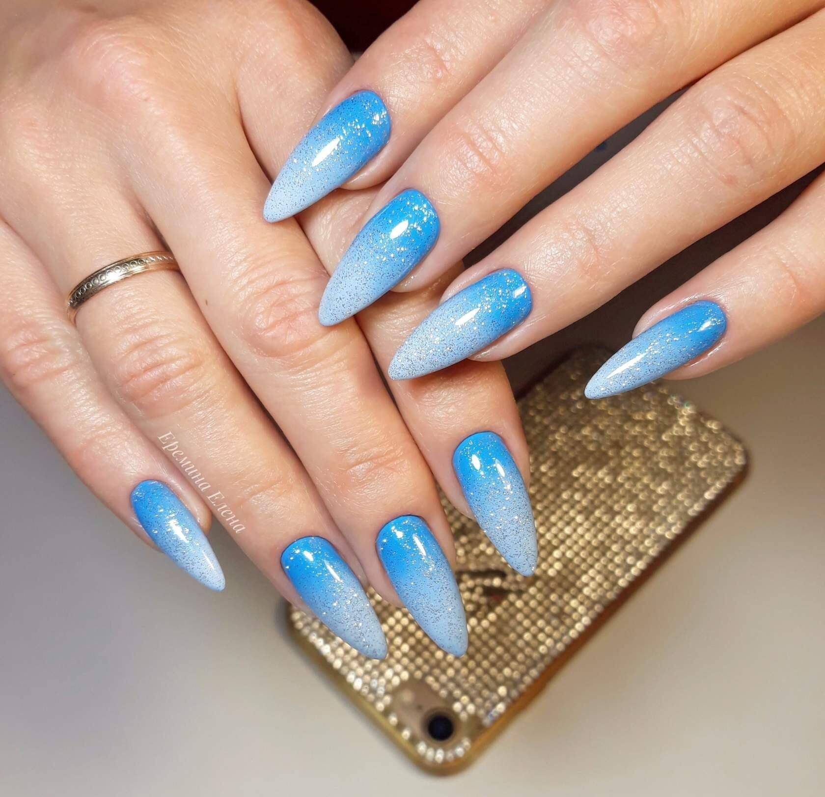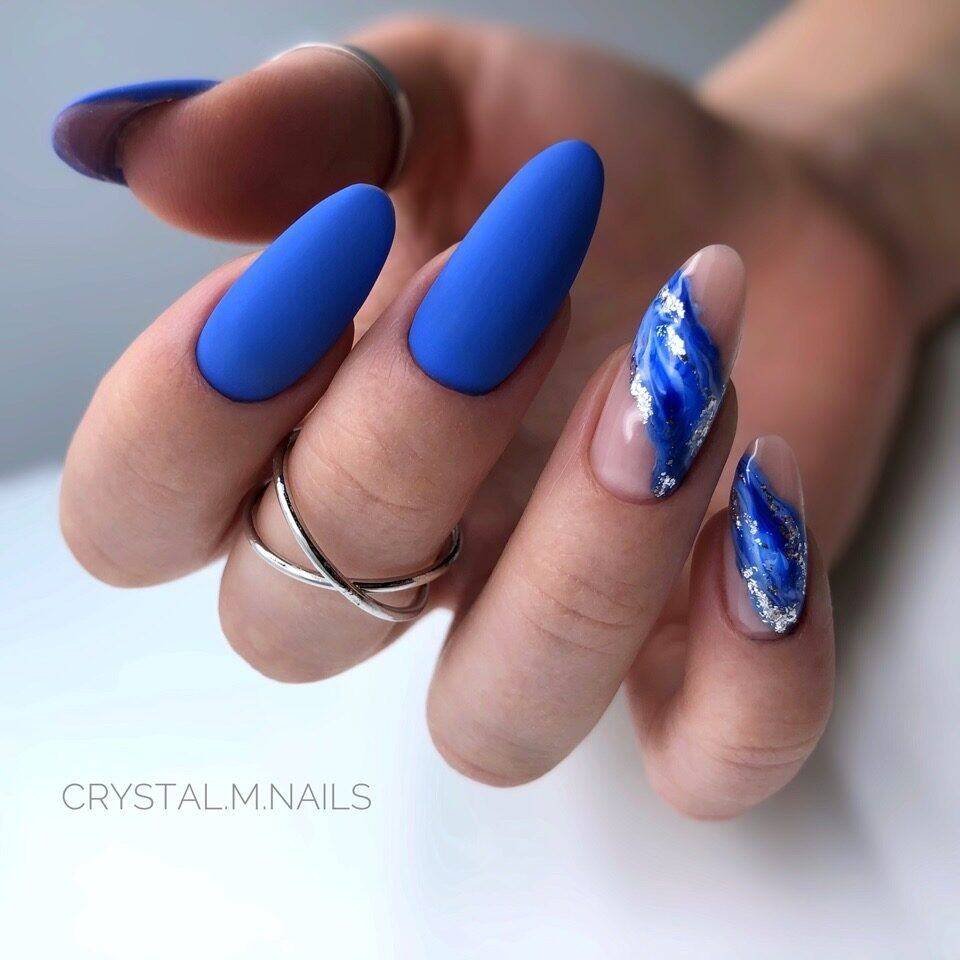 Сверкающий дизайн, от которого сложно оторвать взгляд. Этот шикарный декор подойдет для ярких и роскошных образов. Удачно смотрится на пыльно-голубом покрытии, если у девушки намечается свадьба. А маникюр в яркой синей цветовой гамме — дополнит вечерний образ. Например, нанесите на один-два или четыре ногтя втирку — микроскопическую пыль, можно и на френч.