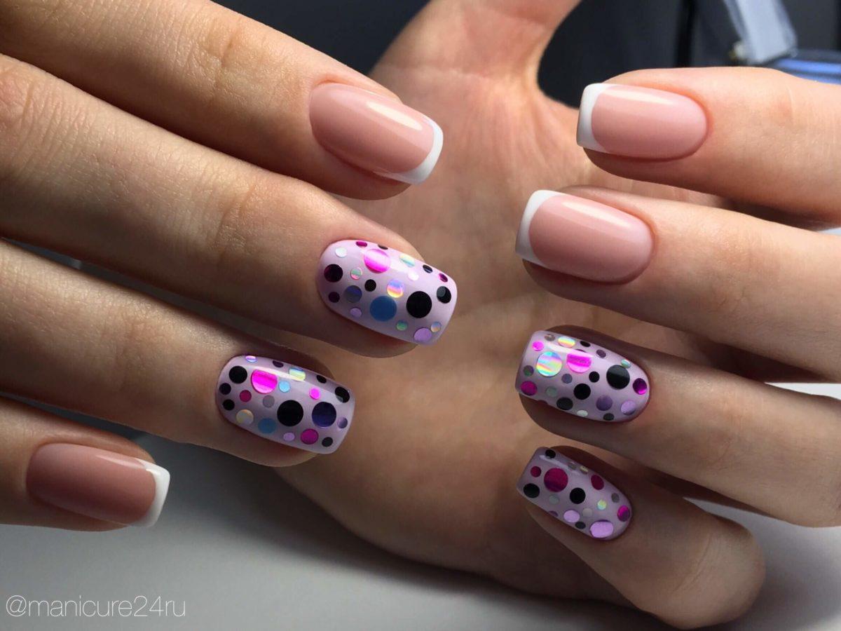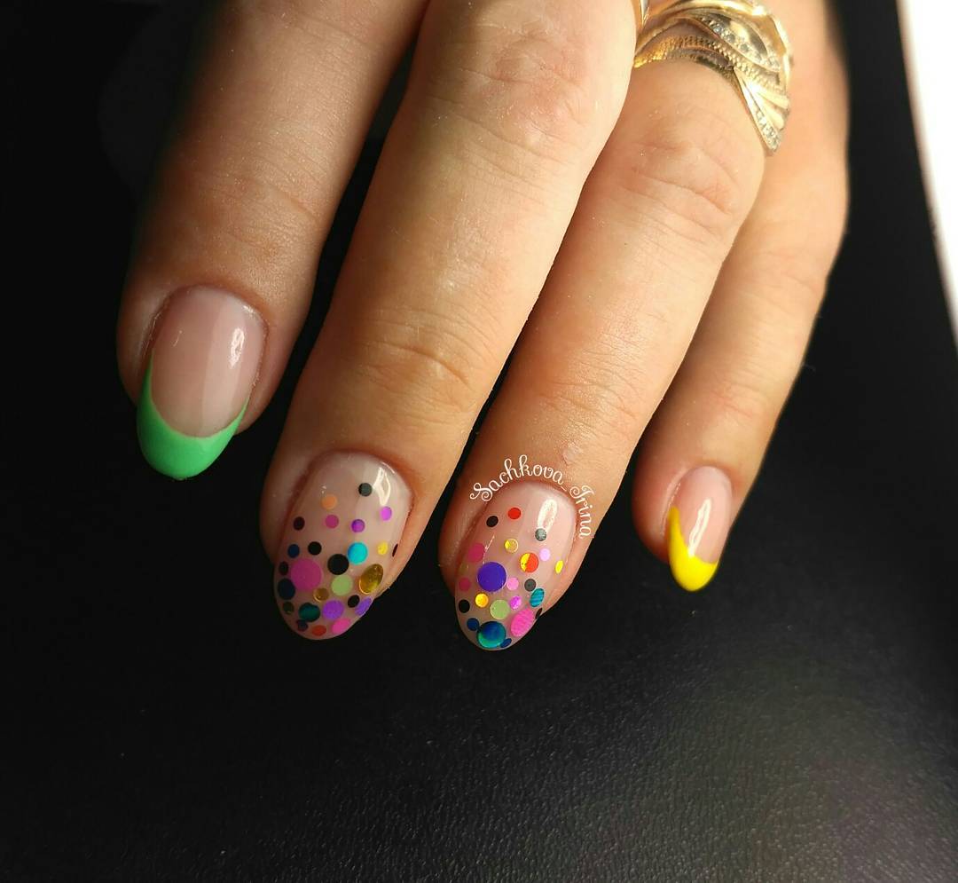 С французским маникюром нередко комбинируют радужный дизайн. Это плавный переход оттенков для которого используются все цвета радуги. В результате получается яркий, свежий маникюр — идеальный вариант на лето.