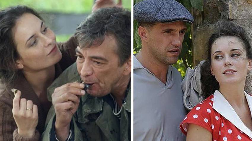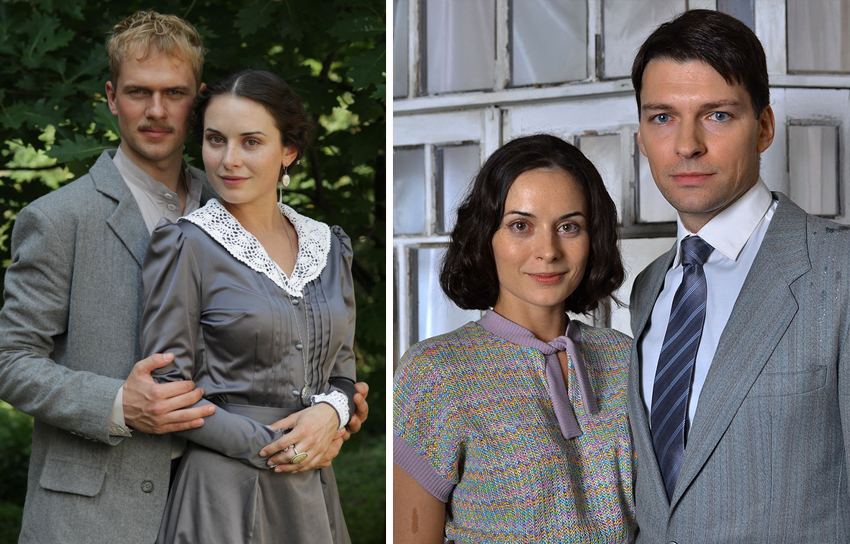 Екатерина Олькина. Слева с Вячеславом Дробинковым в фильме также кино, кинофильм, телефильм, кинокартина — отдельное произведение киноискусства “Пока станица административная казачья сельская единица, состоит из одного или нескольких казачьих поселений (хутора, посёлка) спит”, 2014 год. Справа с Даниилом Страховым в фильме “Семейный альбом”, 2015 год