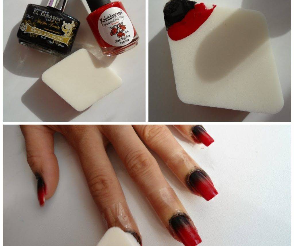 Губку нужно разрезать на полоску, равную ширине вашей ногтевой пластины. Затем берутся заранее приготовленные два оттенка лака (или больше) и с помощью кисточки поочередно наносится каждый оттенок лака на губку.