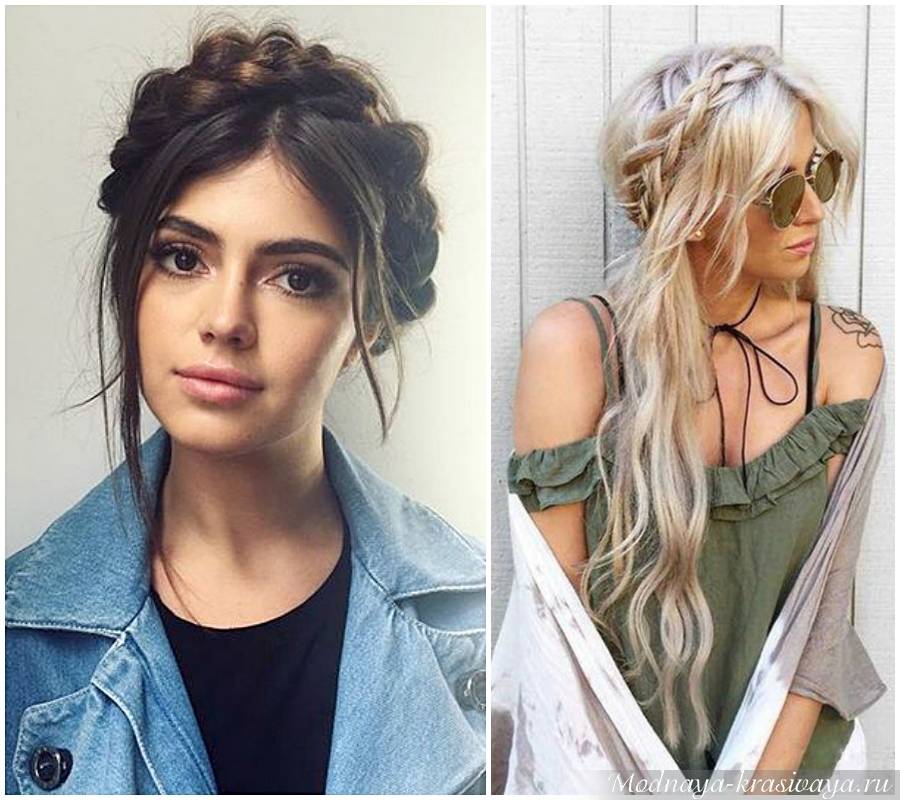 Подчеркнуть прямую осанку и грациозную шею подвластно короне из кос. Из прядей плетут косы, свободные концы которых закрепляют шпильками на затылке. Челка на глаза не помешают образу. Стили гранж и кэжуал охотно примут в свои ряды, украсив клетчатой юбкой и потертыми ботинками на шнуровке.