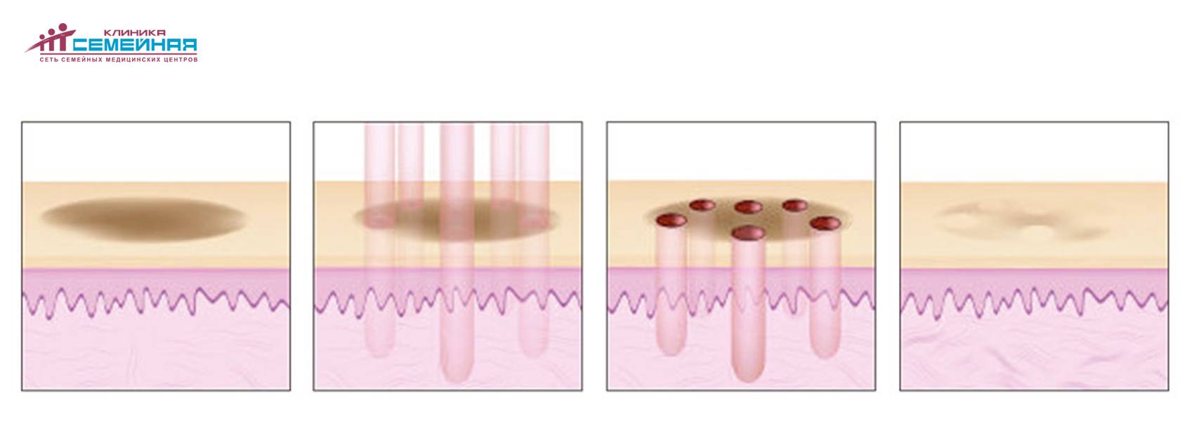 При проведении данной процедуры фракционный лазер прожигает в рубцовой ткани микроскопические отверстия, которые достают до глубоких слоев кожи. Такое воздействие вызывает активный рост молодых клеток, волокон и капилляров, которые постепенно замещают ткани рубца или шрама. Многократное повторение лазерной шлифовки фракционным методом делает рубец или шрам более светлым и мягким, а его рельеф выравнивается с уровнем кожи.