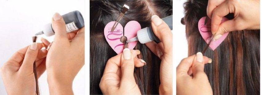 - Испанская .Соединение происходит с помощью клея, который, при высыхании, образовывает прочную капсулу. Недостаток способа — высохший клей светлеет и становится заметным. Поэтому испанская методика подходит только обладательницам светлой шевелюры.