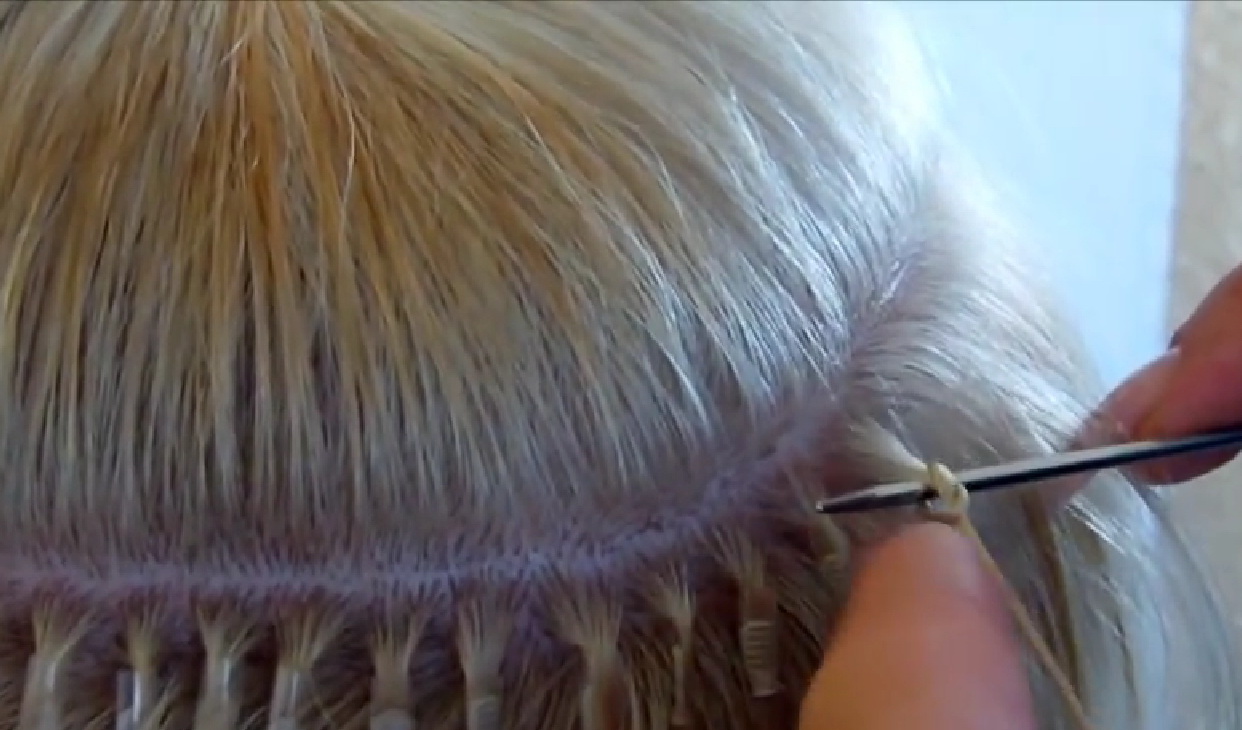 - колечко или микробусинка надеваются на собственную прядь волос, затем в это же отверстие крючком мастер продевает донорские волосы,
