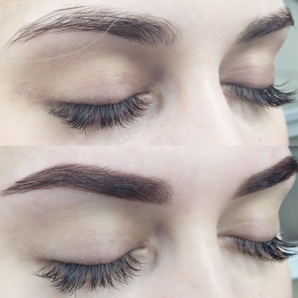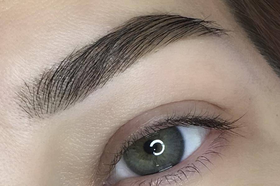 - Татуаж бровей. Самый популярный вид коррекции цвета и формы бровей, который сохраняет эффект до двух лет. Пудровое напыление и микроблейдинг можно выполнить в салоне или brow-баре.