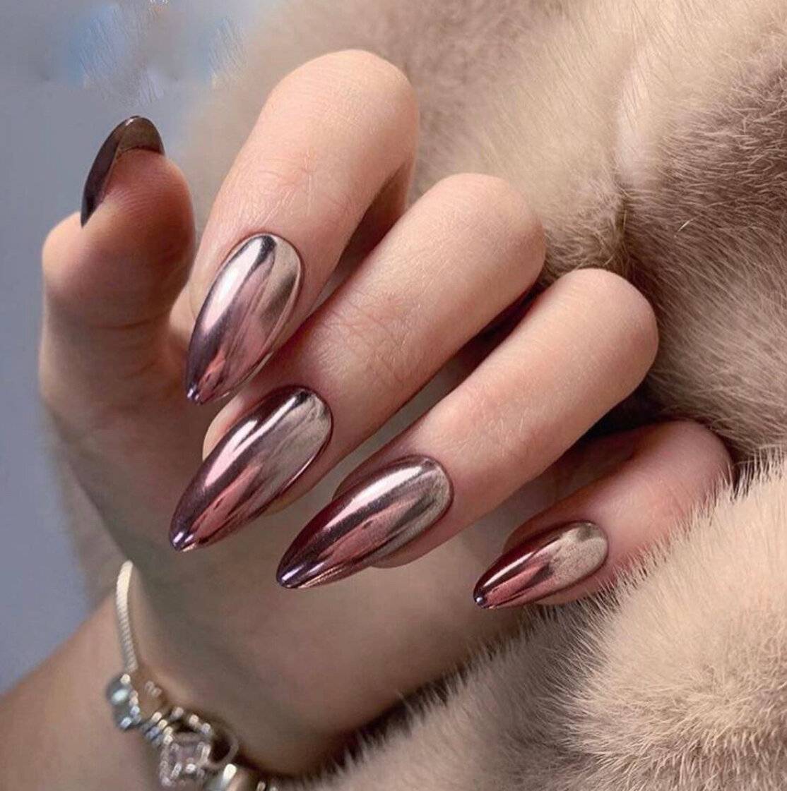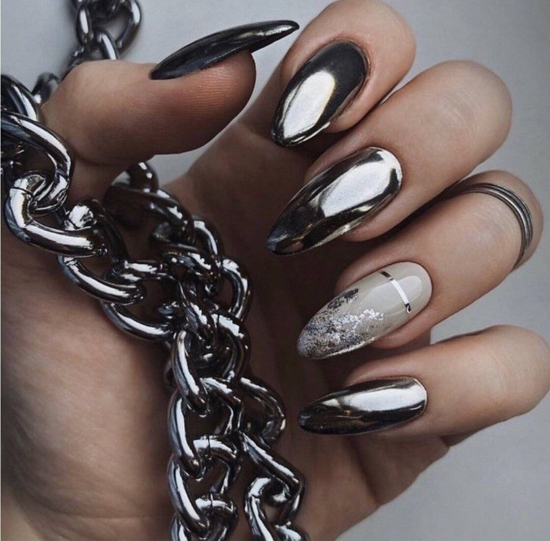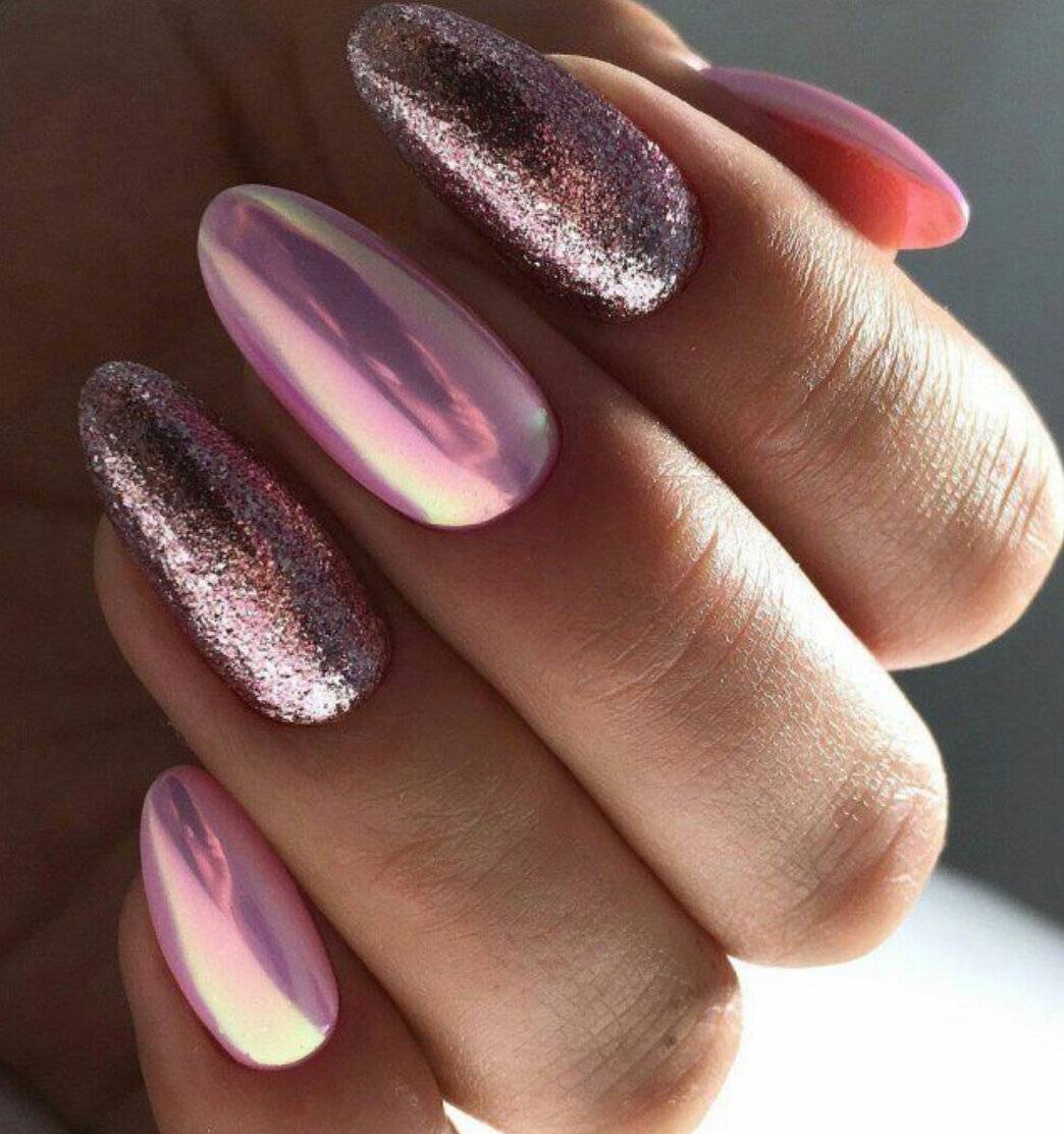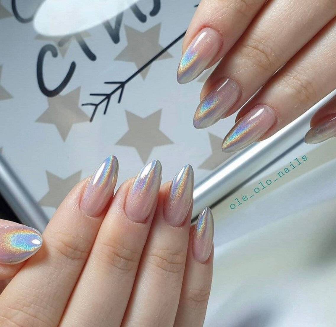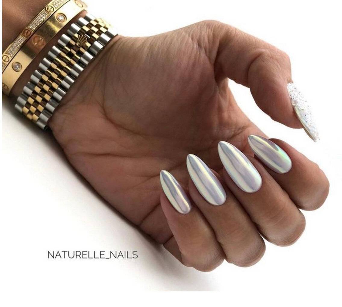 Наличие длинных ногтевых пластин позволяет более ярко продемонстрировать всё волшебство блестящих переливов, на которые только способна втирка. В этом случае вы можете использовать любой вид материала. Главное, чтобы сияние маникюра гармонично смотрелось с вашим образом. Втирка может использоваться для покрытия всех ногтевых пластин, комбинироваться с рисунками, различными техниками и декором. К примеру, выполняем маникюр с одним из галографических видов пудры и располагаем на безымянном и среднем пальце объёмные цветы с жемчугом или наносим на сверкающую поверхность узоры паутинки с мелкими кристаллами. Просто потрясающе!