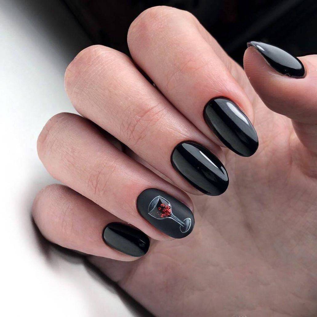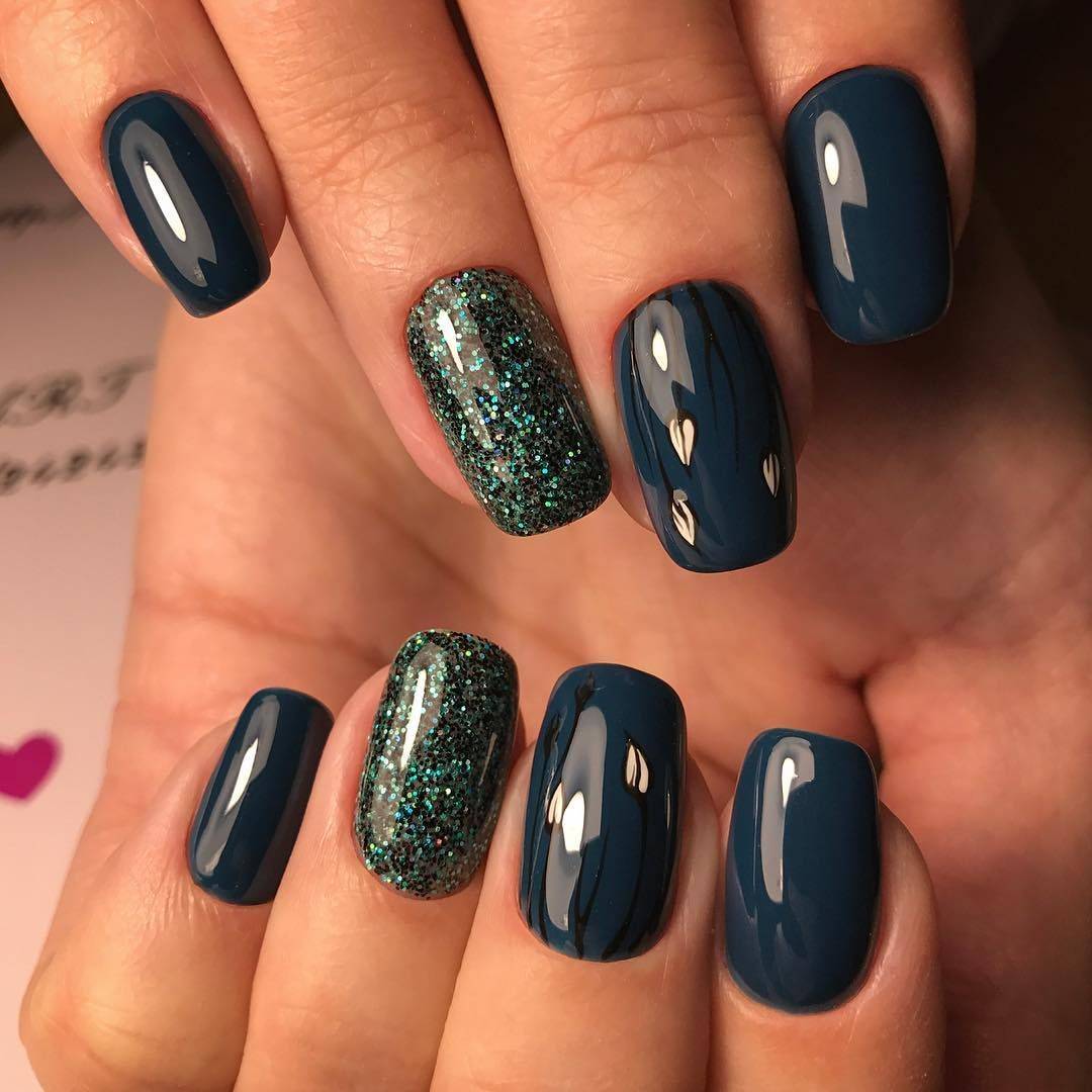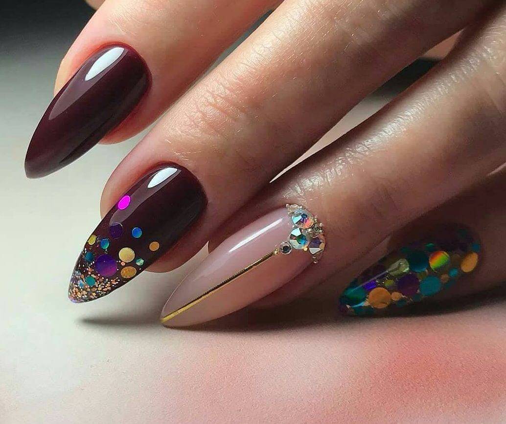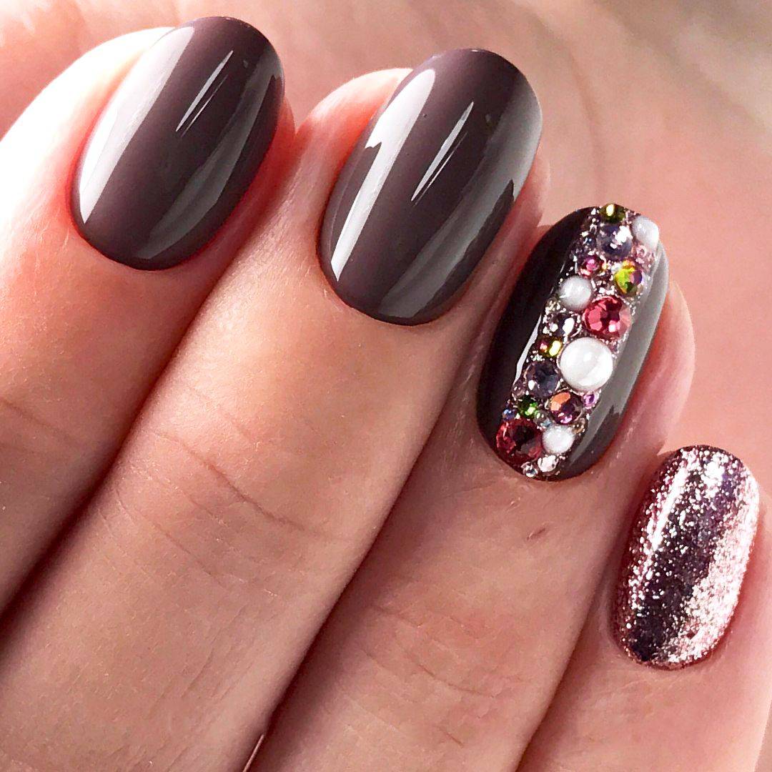 Не смотря на то, что многие барышни стараются избегать в маникюре сочетания тех или иных тёмных оттеков, маникюр в подобном исполнении всегда смотрится изысканно и роскошно. А каким образом можно комбинировать тёмные оттенки покрытий на ноготках между собой вы сможете увидеть на фото примерах ниже. В списке стильных предложений маникюр невероятной красоты в технике «кошачий глаз» с выделением более тёмным цветом безымянного пальца с последующим его украшением стразами. Маникюр с вертикальными полосками и горохом. Нейл-дизайн с рисунками в витражном стиле и шикарный градиент с переходом в чёрный или более светлый оттенок на кончиках ногтевых пластин. А также тёмные ноготки с контрастными вензелями, маникюр с пудровыми рисунками, дизайн с блёстками, нейл-арт с прозрачными участками или маникюр с оттисками фольги в тон покрытий.