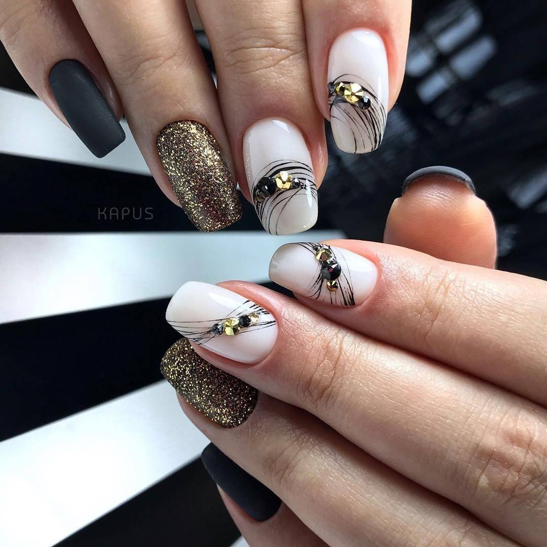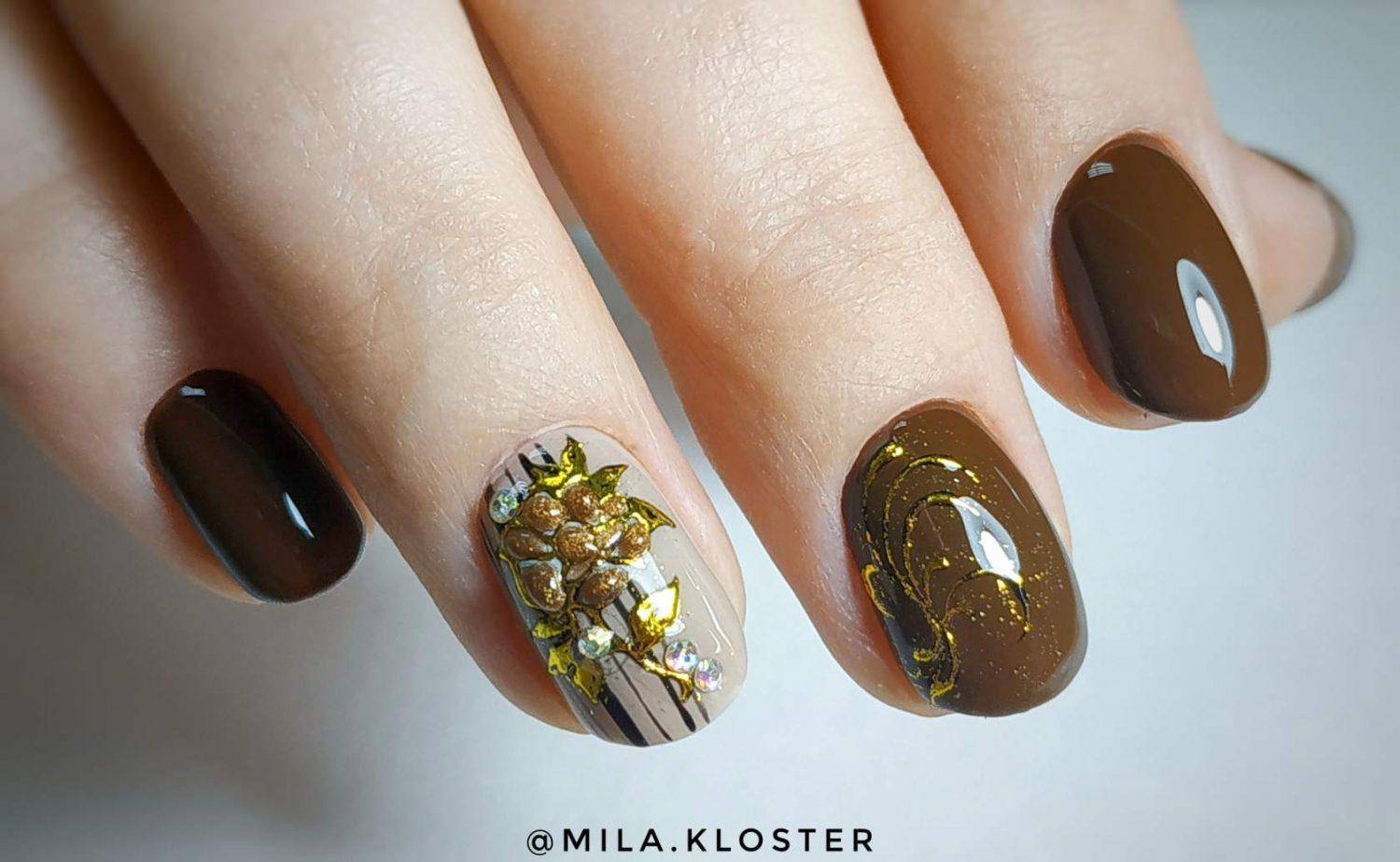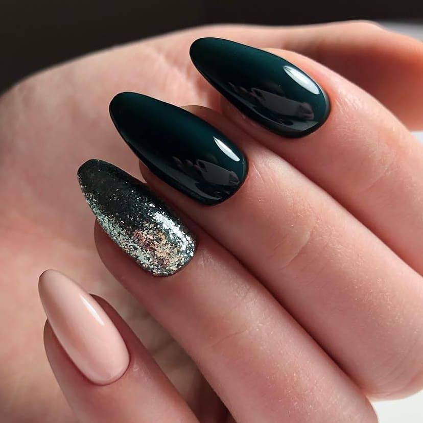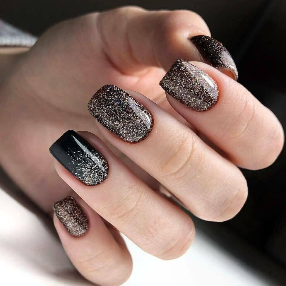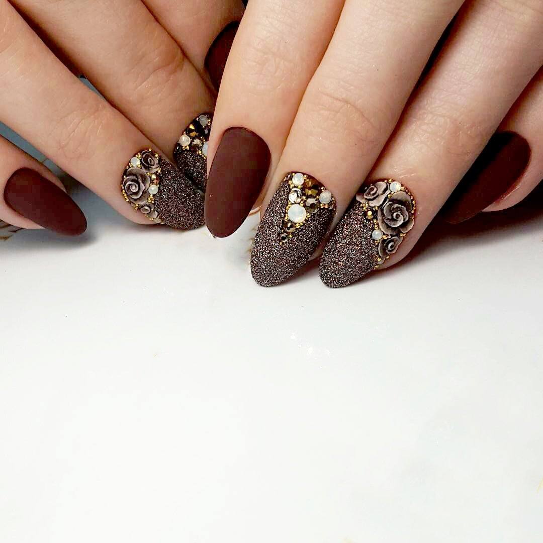 Не смотря на то, что многие барышни стараются избегать в маникюре сочетания тех или иных тёмных оттеков, маникюр в подобном исполнении всегда смотрится изысканно и роскошно. А каким образом можно комбинировать тёмные оттенки покрытий на ноготках между собой вы сможете увидеть на фото примерах ниже. В списке стильных предложений маникюр невероятной красоты в технике «кошачий глаз» с выделением более тёмным цветом безымянного пальца с последующим его украшением стразами. Маникюр с вертикальными полосками и горохом. Нейл-дизайн с рисунками в витражном стиле и шикарный градиент с переходом в чёрный или более светлый оттенок на кончиках ногтевых пластин. А также тёмные ноготки с контрастными вензелями, маникюр с пудровыми рисунками, дизайн с блёстками, нейл-арт с прозрачными участками или маникюр с оттисками фольги в тон покрытий.