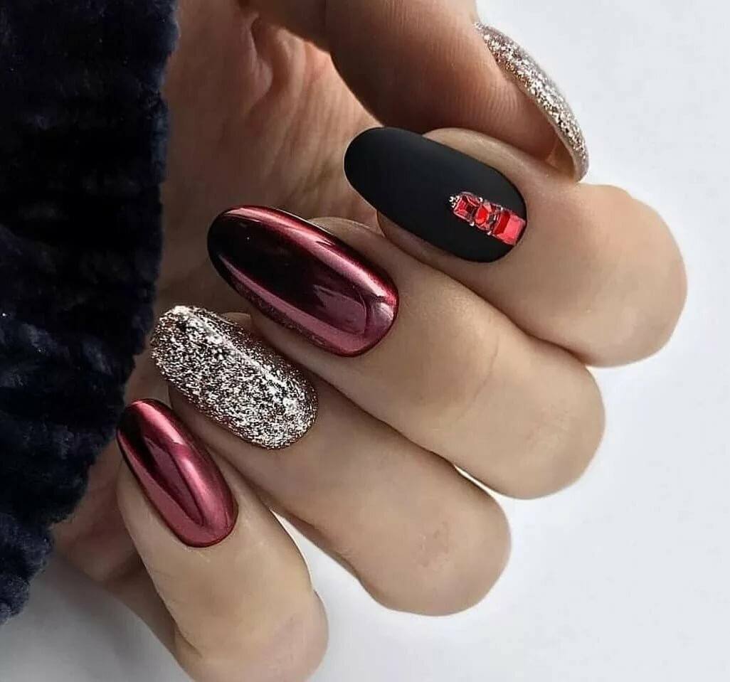 Эффектный бордо — вечная классика маникюра. Лучше всего на бордовом лаке смотрится контрастный дизайн в чёрной, золотой, серебряной и белой цветовой гамме. Отличным декором станут стразы и слюда.