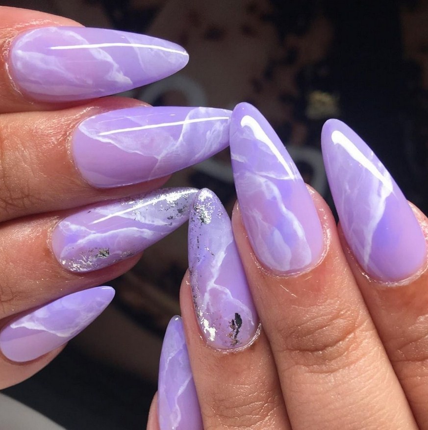 Фиолетовый и белый — классическое сочетание, которое создает свежий и элегантный образ. Вы можете использовать белый цвет для рисунков в мраморном фиолетовом маникюре или для акцентного ногтя.