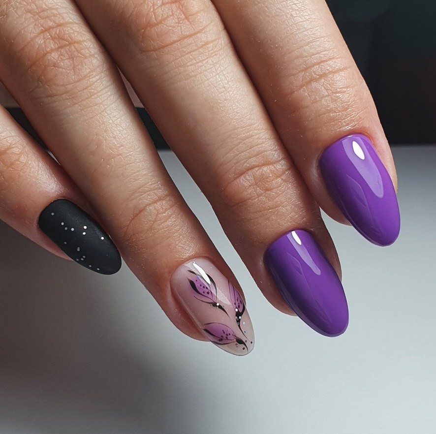 Фиолетовый и желтый цвет — выразительное и живое сочетание. Желтый можно использовать для акцентов или создания рисунков вместе с фиолетовыми оттенками, что добавит яркость и солнечность к вашему маникюру.