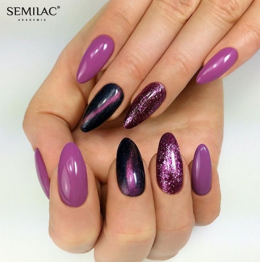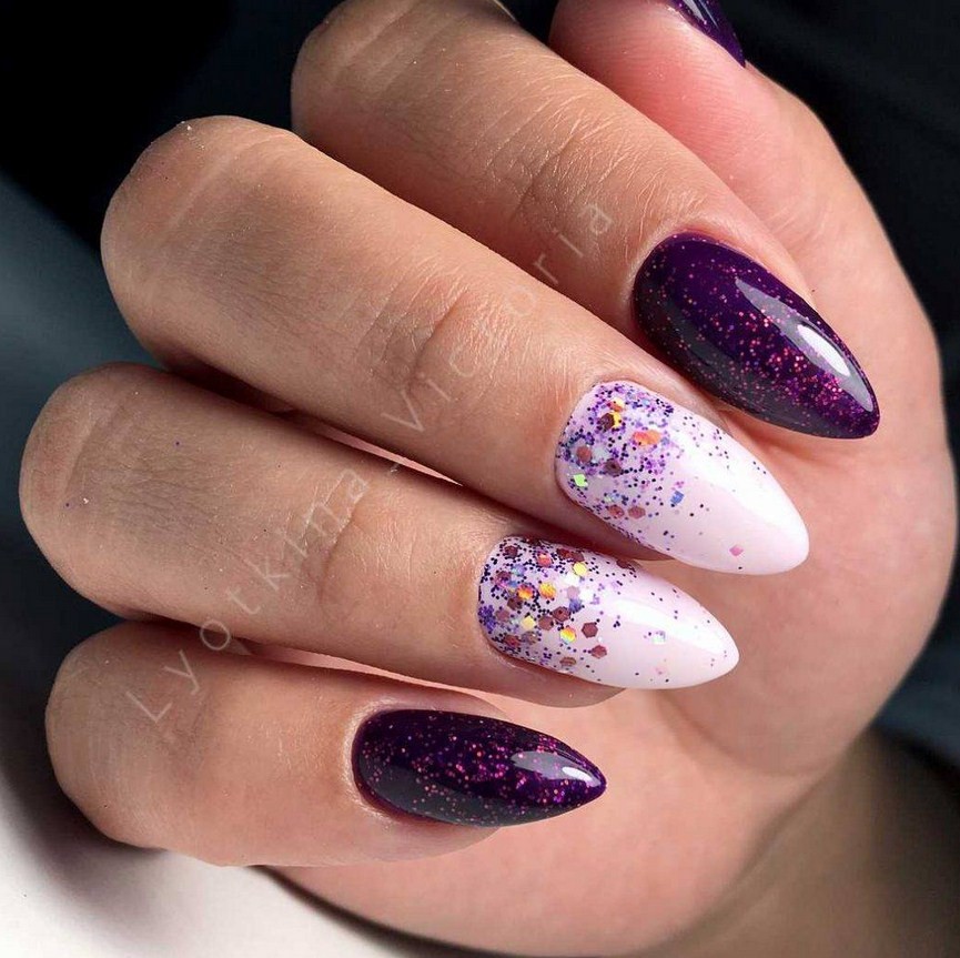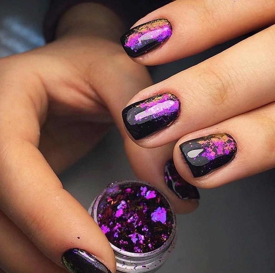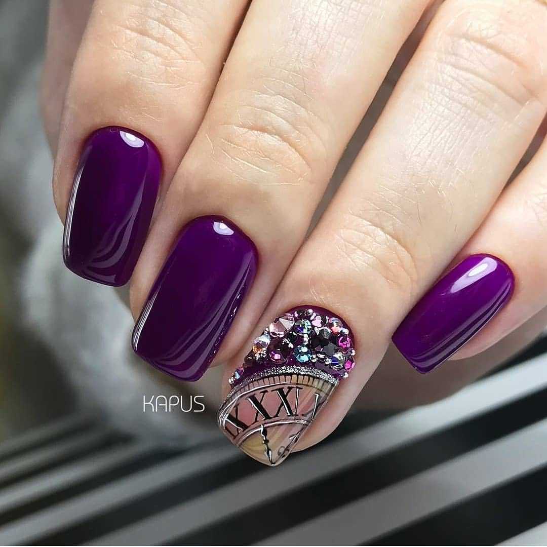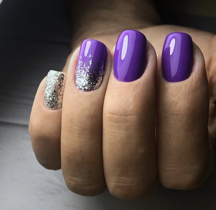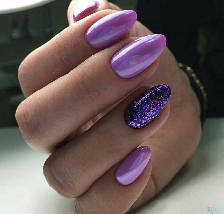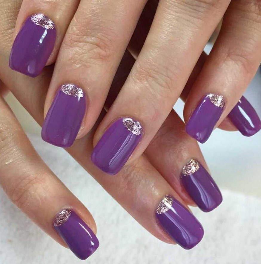- глиттер: нанесите фиолетовый глиттерный лак на ногти или создайте акцентный ноготь;