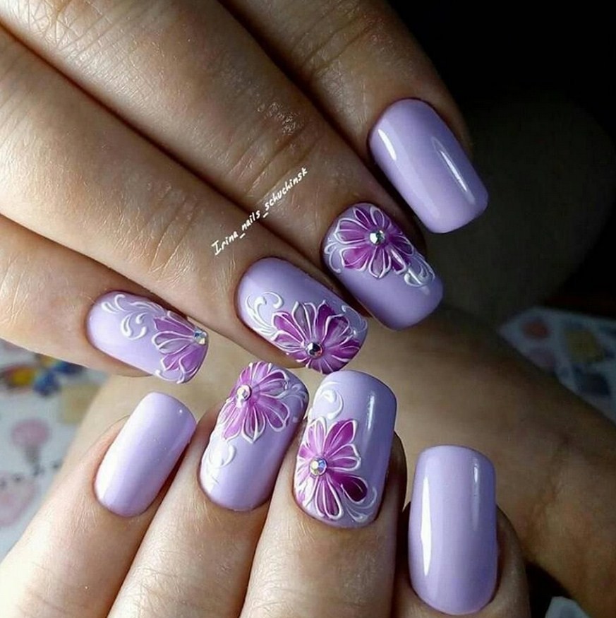 Сиреневый дизайн ногтей с флористическими принтами можно назвать классическим способом декорирования ногтевых пластин. Особенно красивыми будут цветочки в технике ручной росписи, выполняемые мастером – весенние бутоны, тюльпаны, тонкие веточки. С такими рисунками хорошо гармонируют камни, стразы, кусочки фольги.