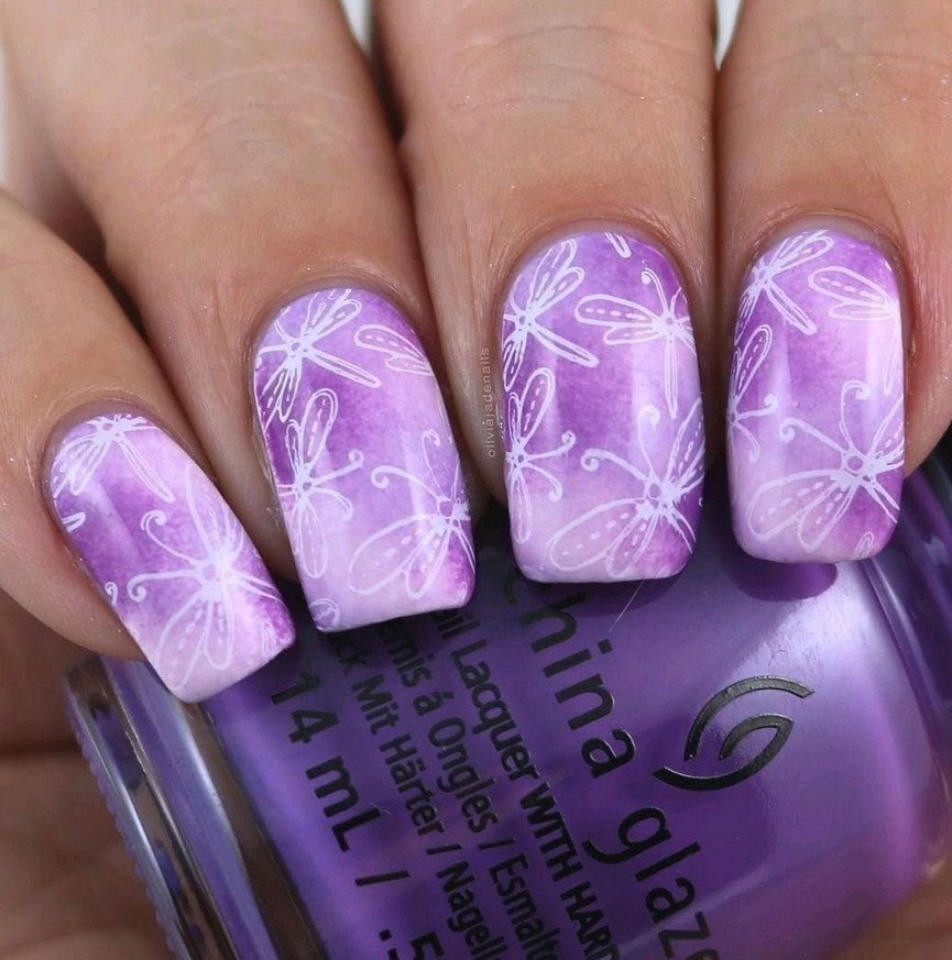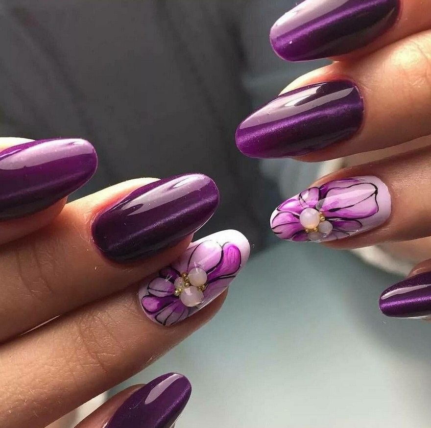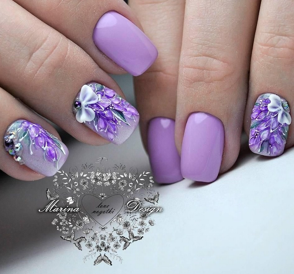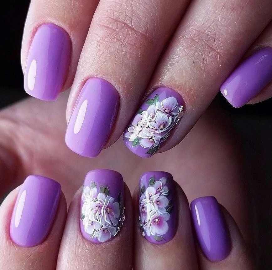 Сирень, фиалки, ирисы и другие фиолетовые цветы служат идеальным дополнением для белой и нюдовой базы. Кроме того, красиво будут смотреться контрастные флористические узоры, нарисованные на фиолетовым фоне.