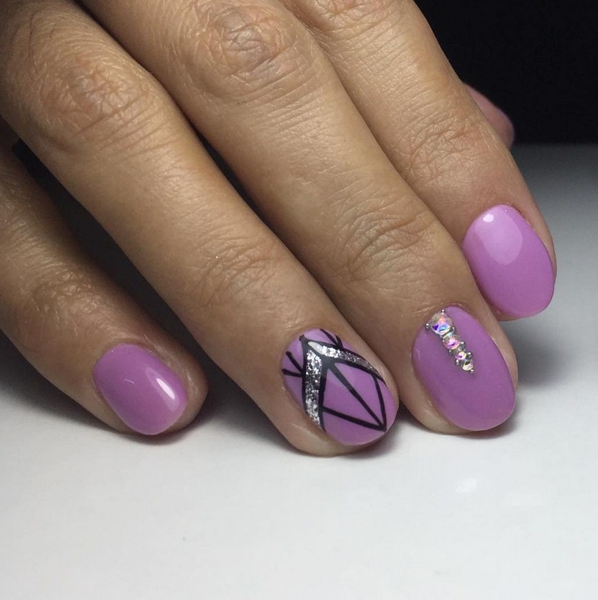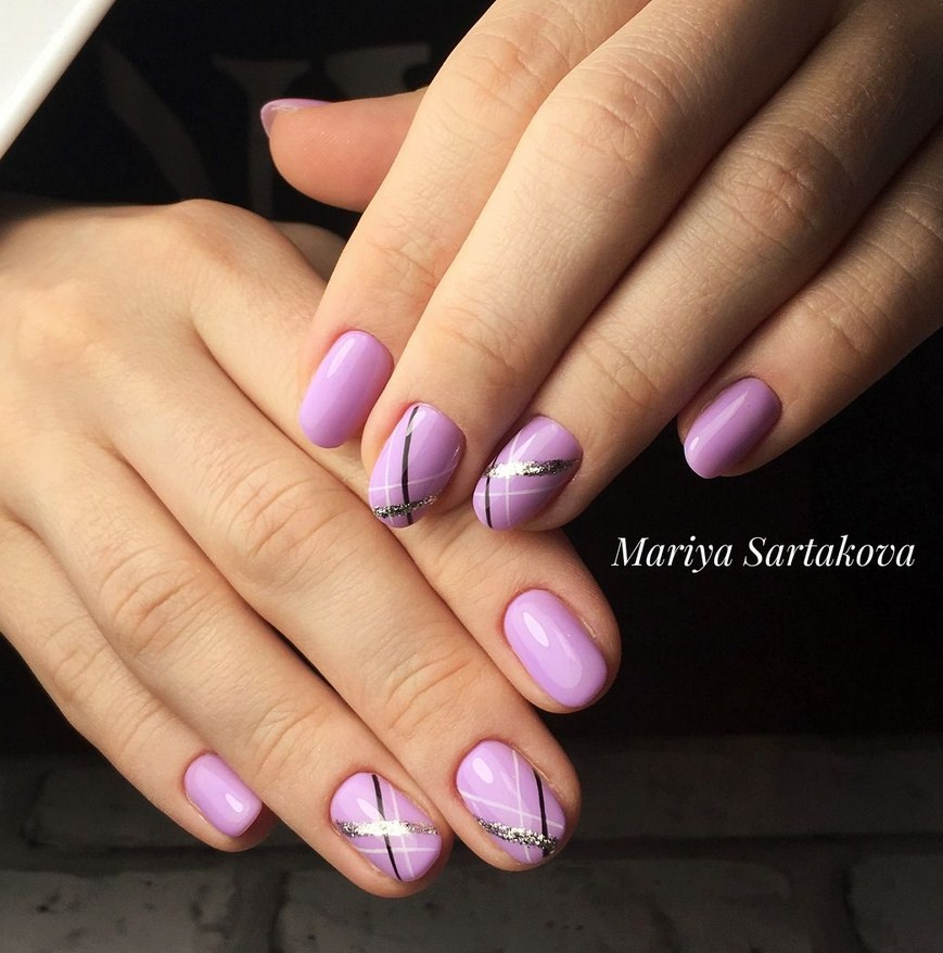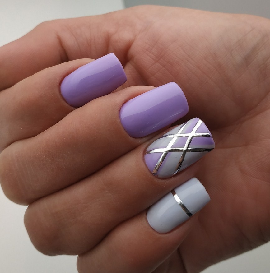 По-прежнему актуальны узоры в минималистическом стиле. Это может быть одна тонкая полоска по вертикали в контрастном цвете на фиолетовом фоне. Можно нарисовать понравившуюся геометрическую фигуру на одном из пальцев. Не стоит отказываться от серебристых акцентов.