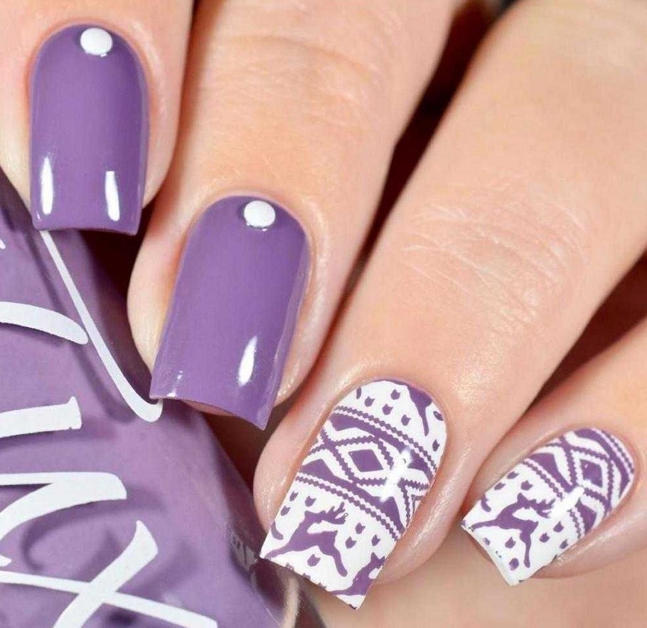 - фиолетовый лак и белые точки: покрасьте ногти фиолетовым лаком и добавьте маленькие белые цветные точки для создания интересного дизайна;