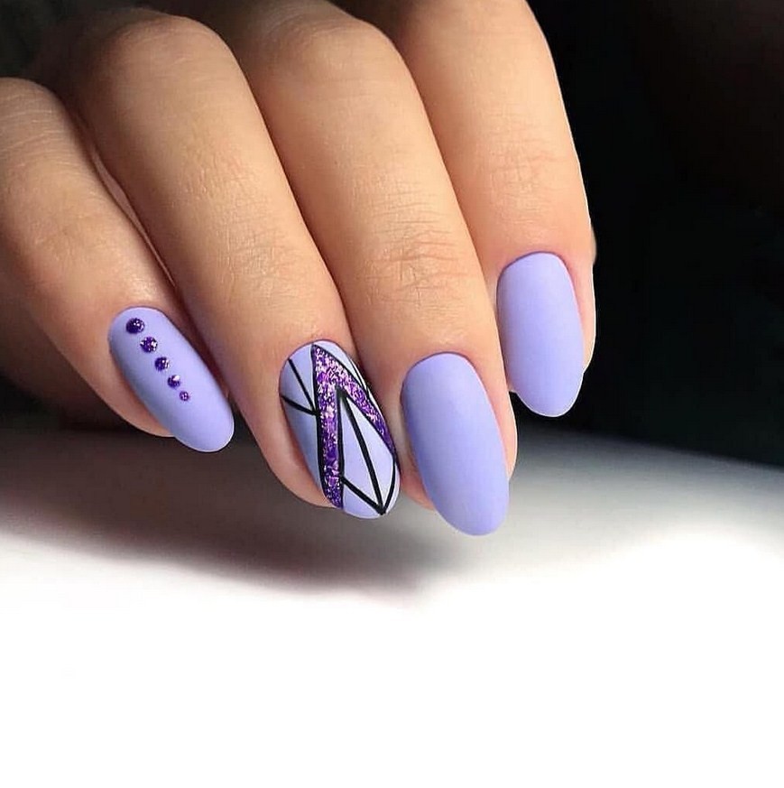Для создания геометрического рисунка необязательно мастерски владеть техникой росписи. Достаточно провести пару линий, широкую полосу, поставить точки, и дизайн будет готов. На базе цвета сирени отлично выглядят блестящий декор в стиле геометрии.